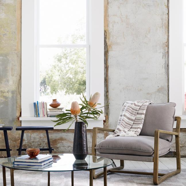 Hauteur des accoudoirs par rapport au siège : 1,68 m - Matériaux : bois d'hévéa, tissu d'ameublement