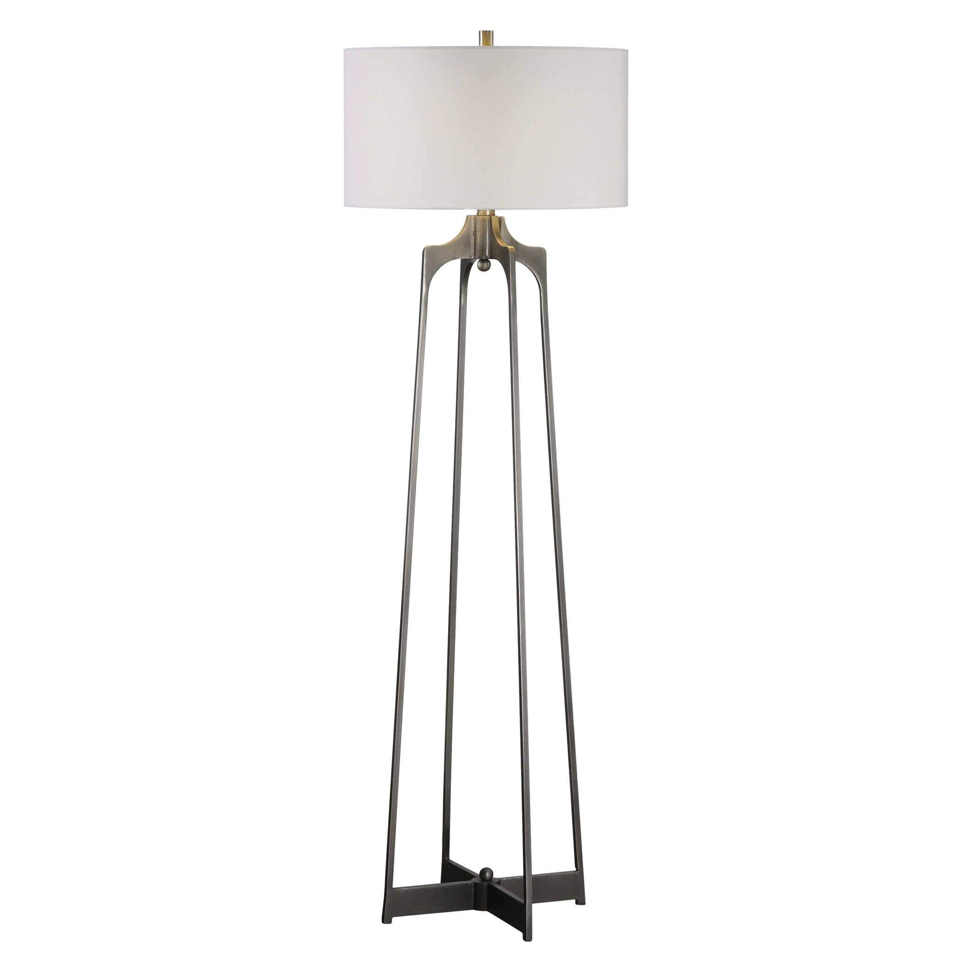 Élégante et raffinée, cette lampe est fabriquée en acier forgé avec une finition bronze vieilli. Son abat-jour tambour rond et rigide est en lin blanc au flammage naturel.