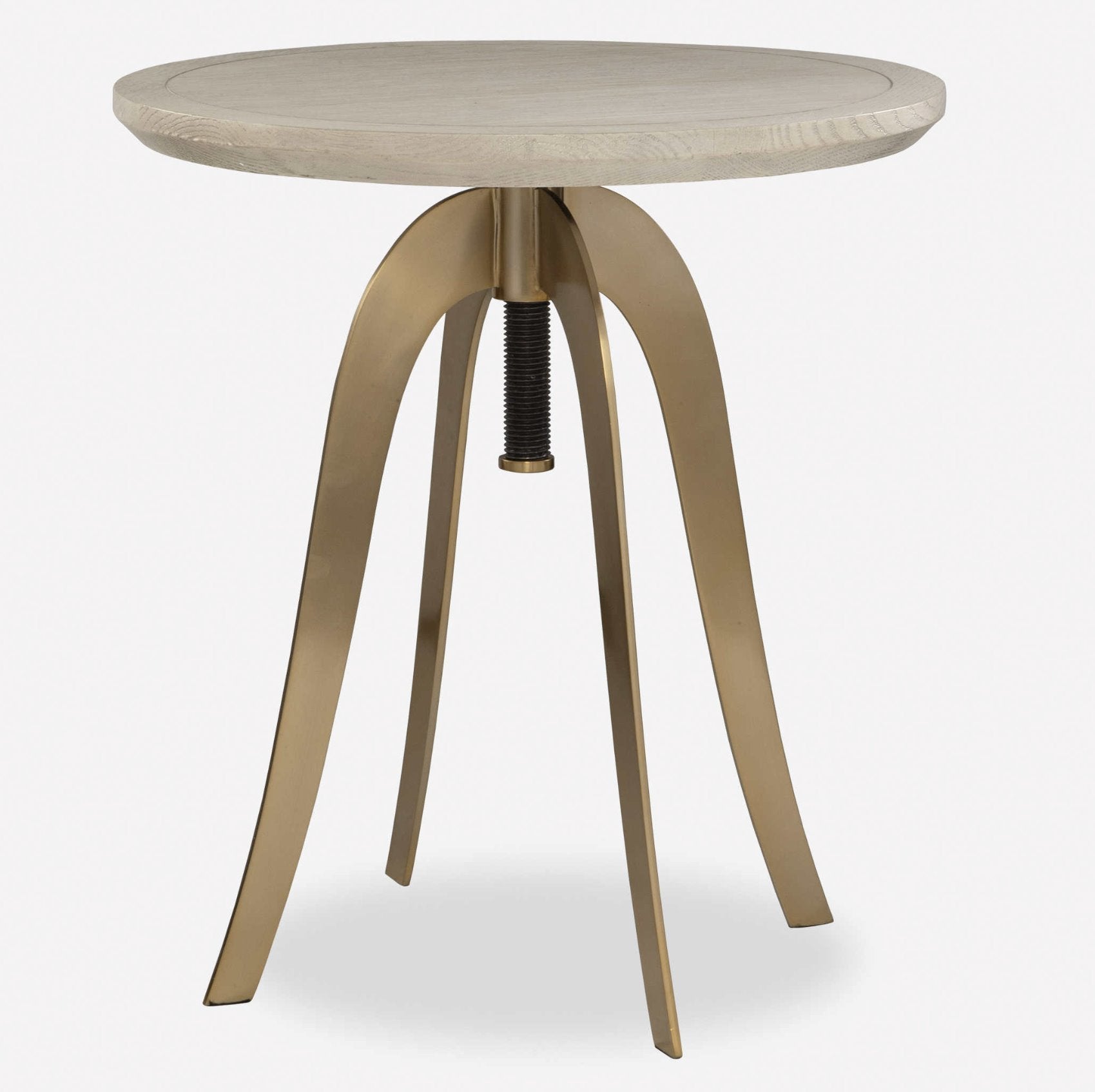 La table d'appoint Alice allie avec brio design moderne et fonctionnalité, et offre une hauteur réglable de 51 à 66 cm. Elle se distingue par ses quatre pieds élégants en acier inoxydable plaqué laiton et son plateau en placage de chêne blanchi.