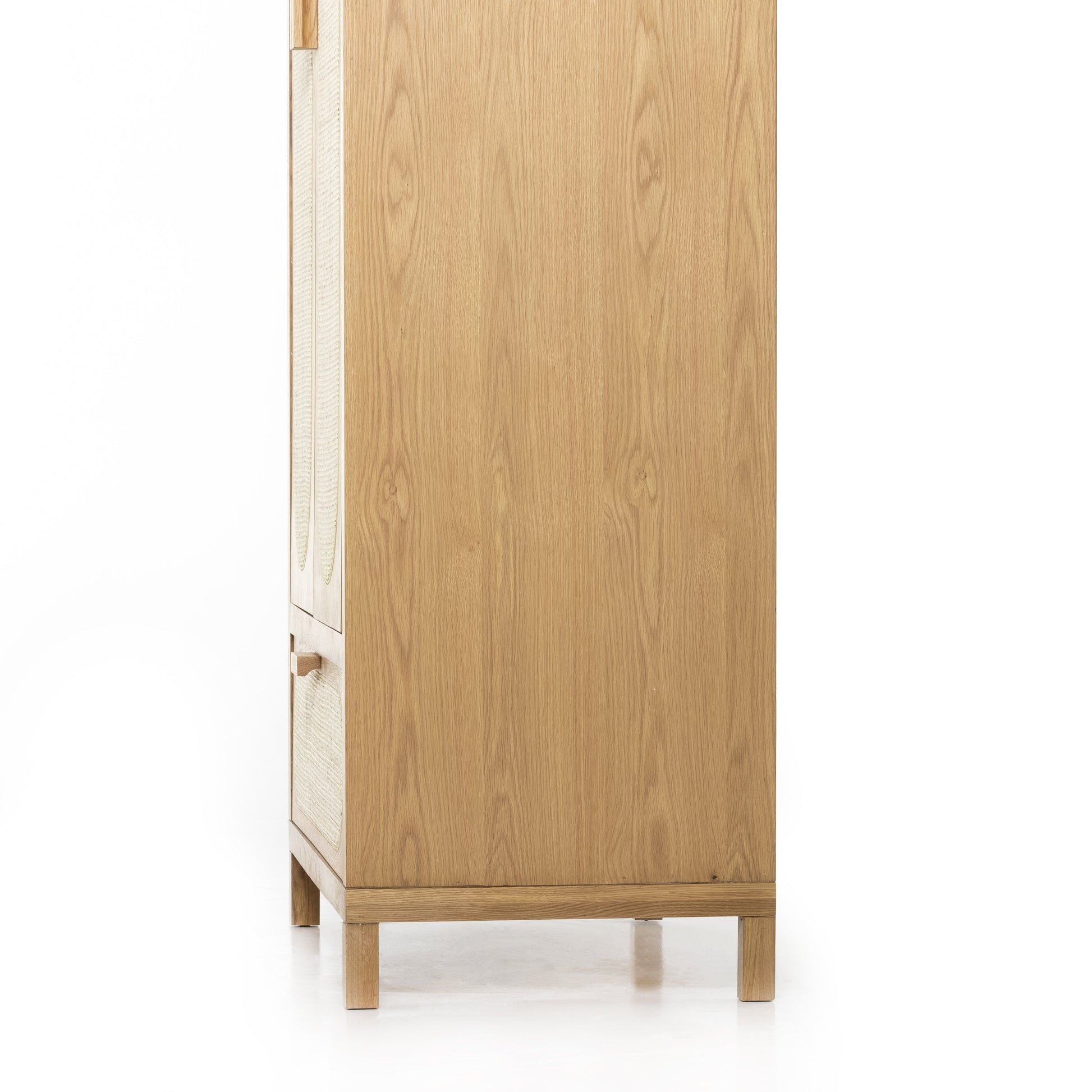 Au naturel. Le chêne finition miel habille les lignes épurées des meubles, rehaussées de panneaux en cannage à la texture unique. À l'intérieur, de spacieuses étagères offrent un grand espace de rangement, complété par un tiroir extérieur en façade.