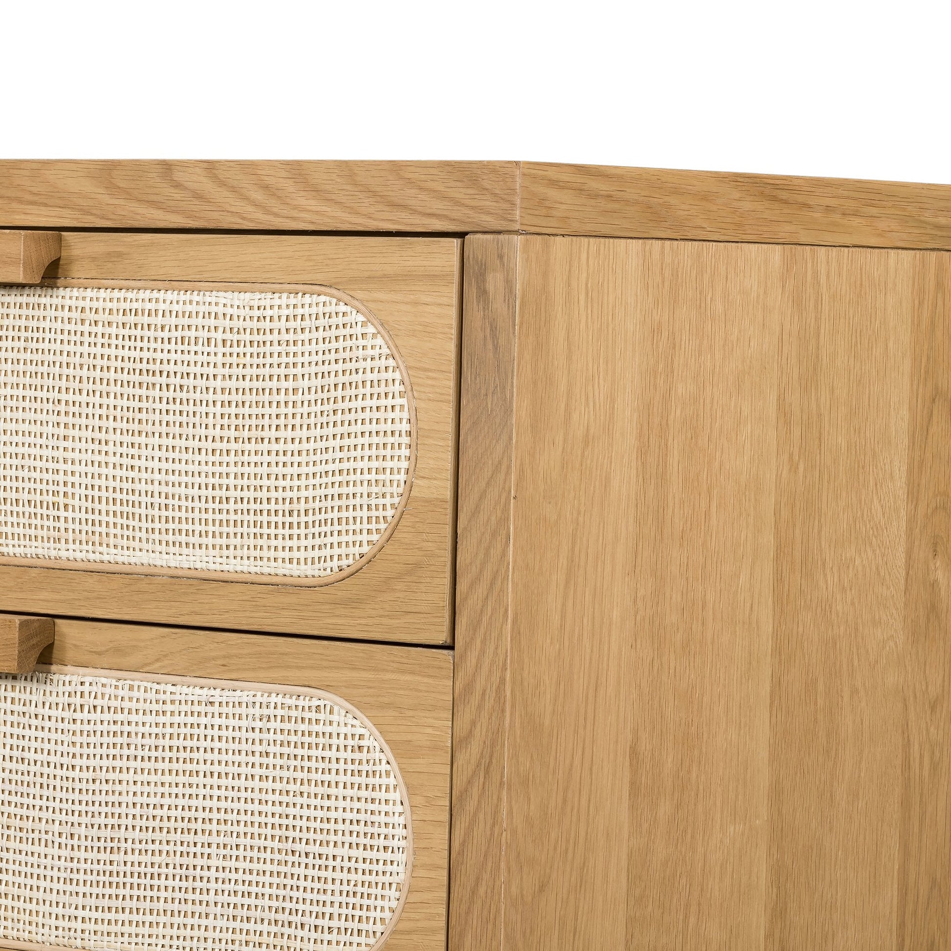 Les façades de tiroirs en rotin naturel de la commode Allegra s'harmonisent parfaitement avec sa finition chêne miel pour un style doux et neutre. Ces commodes font partie de notre collection de meubles Allegra.
