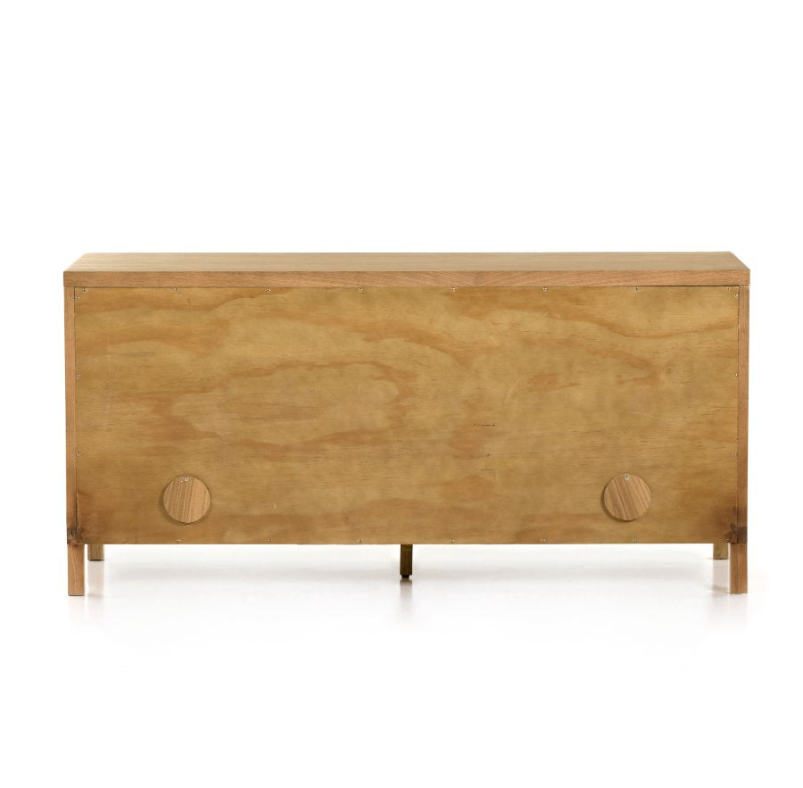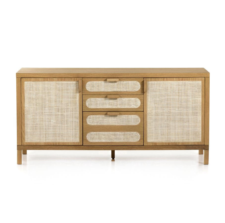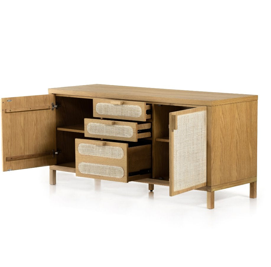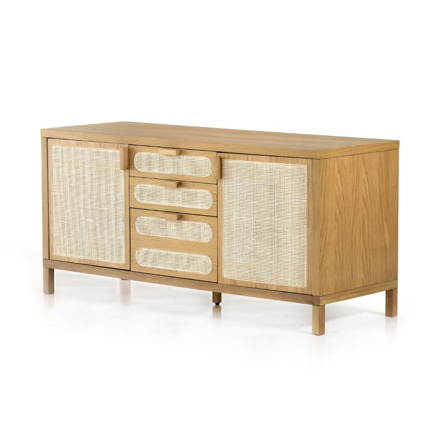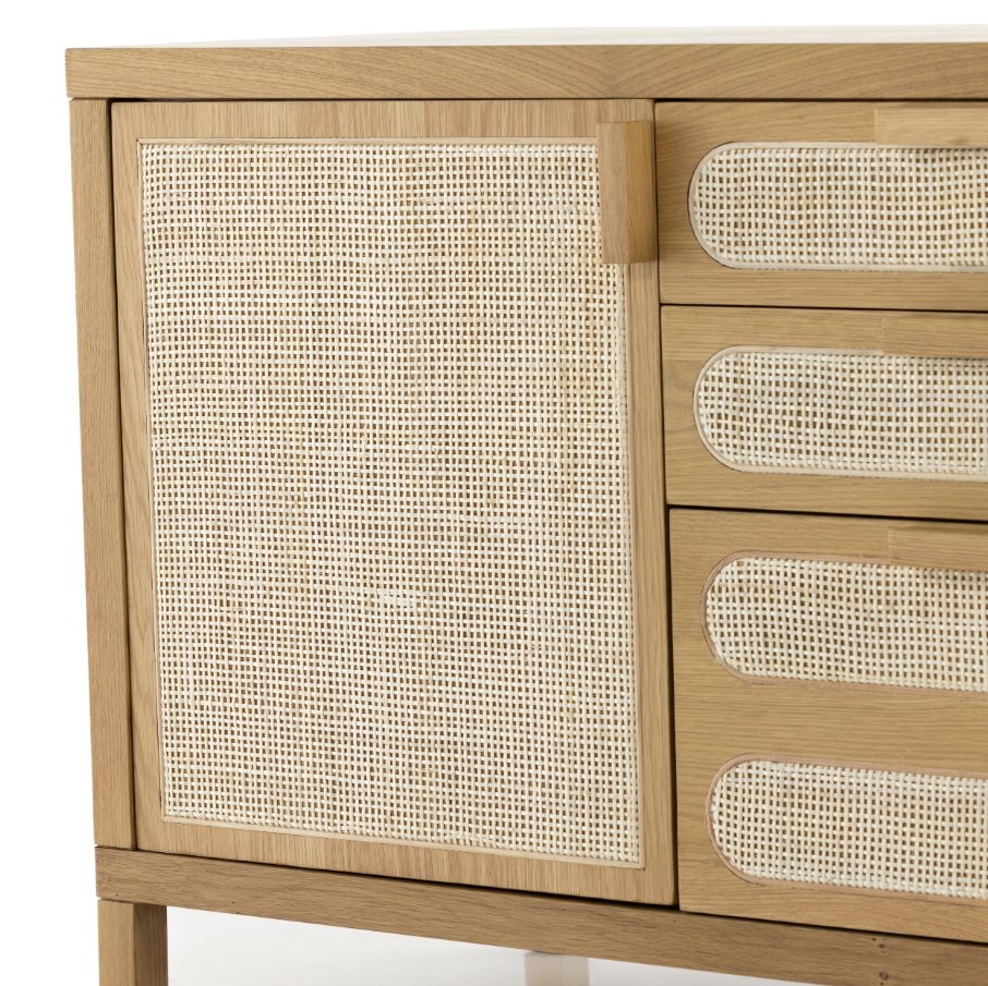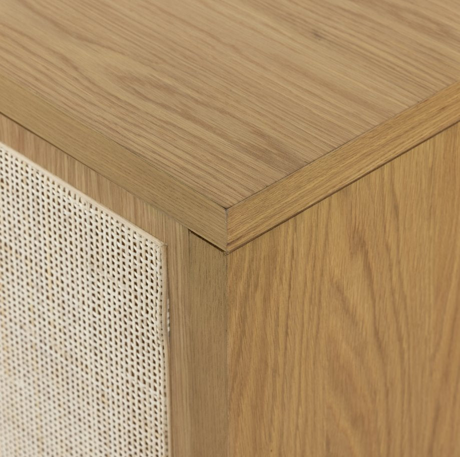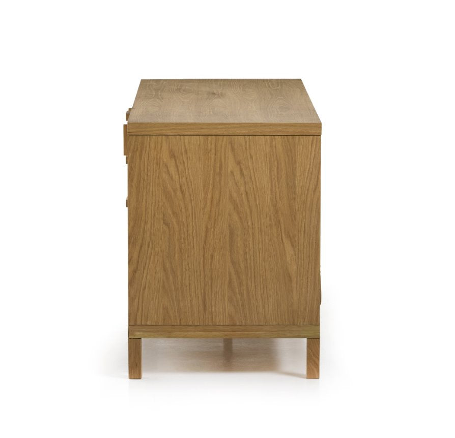 Au naturel. Le chêne finition miel accueille deux tiroirs à fond cannelé et un tiroir plus spacieux pour le rangement des dossiers. Des placards latéraux offrent encore plus de possibilités de rangement, tandis que des découpes à l'arrière facilitent la gestion des câbles.
