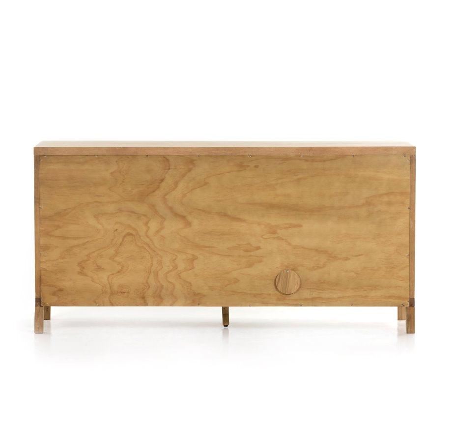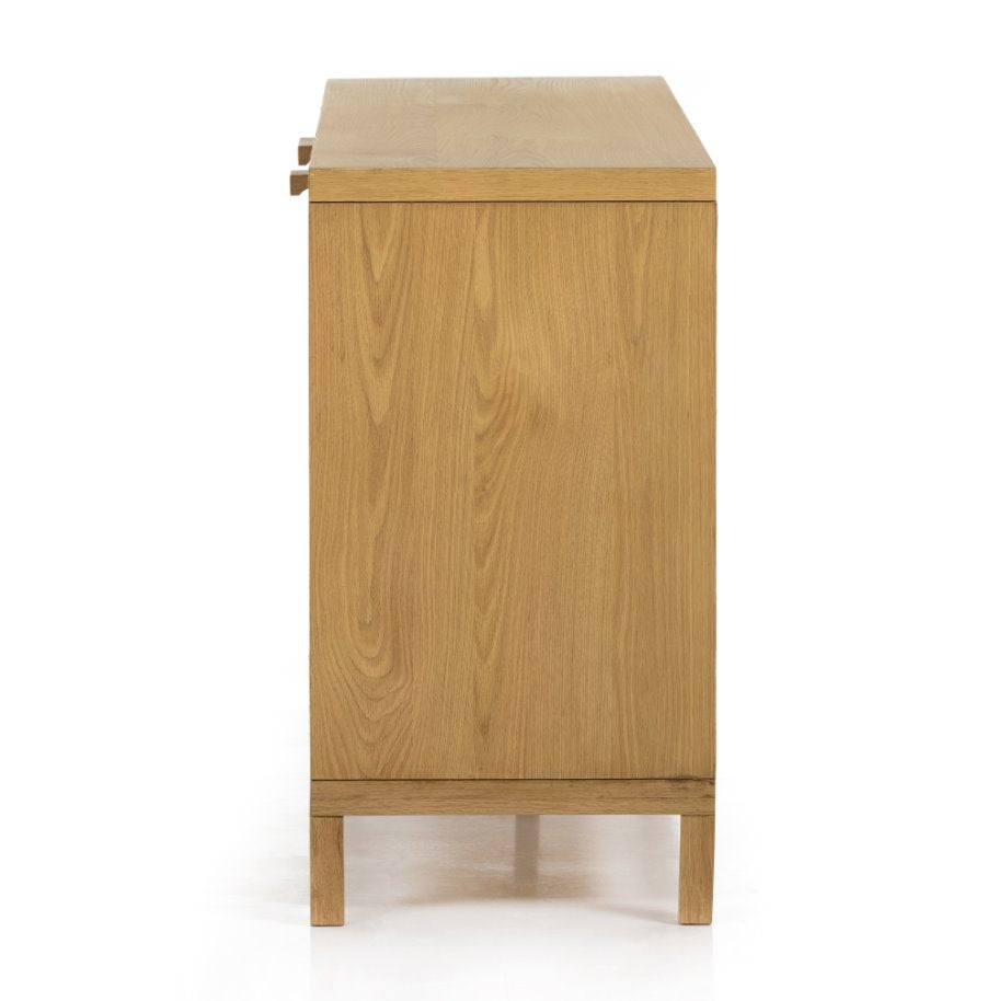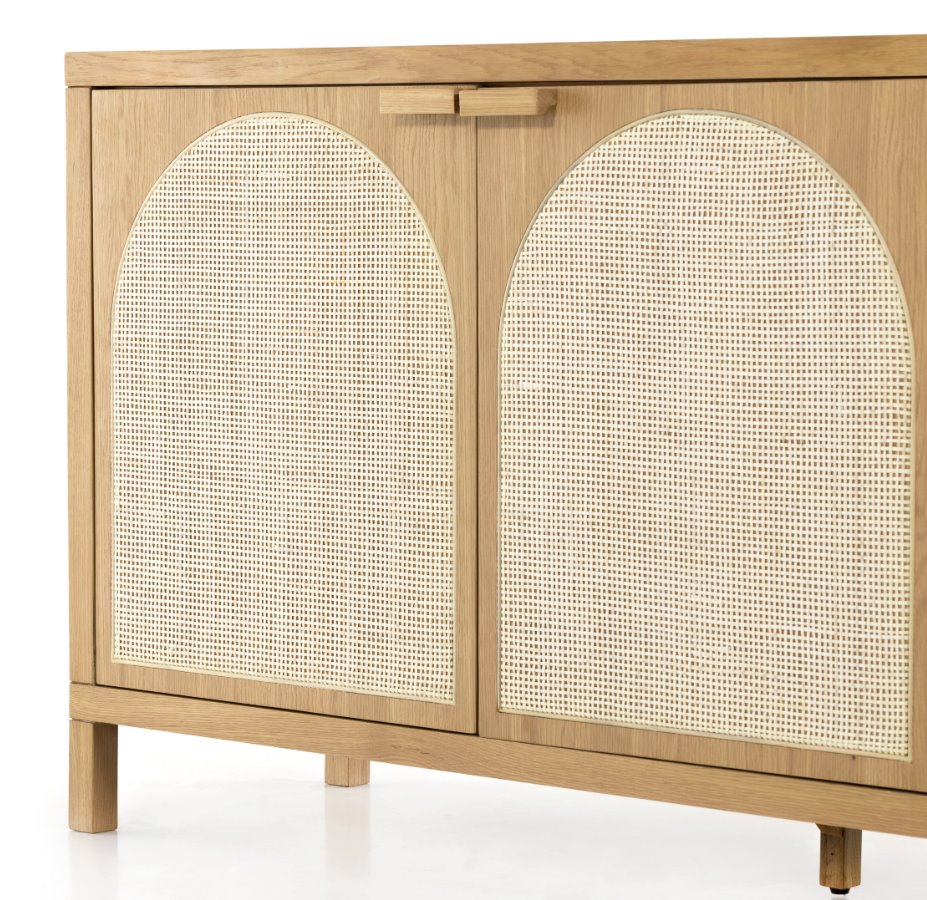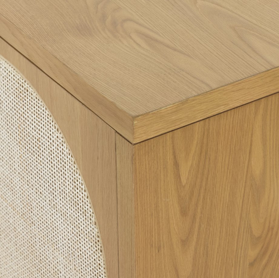 Au naturel. Un spacieux buffet en chêne finition miel présente des portes encastrées en rotin naturel doublé de bois, pour une touche tendance et texturée. Son intérieur généreux offre un espace de rangement pour la vaisselle, le linge de table et autres accessoires, avec des découpes à l'arrière pour une gestion pratique des câbles.
