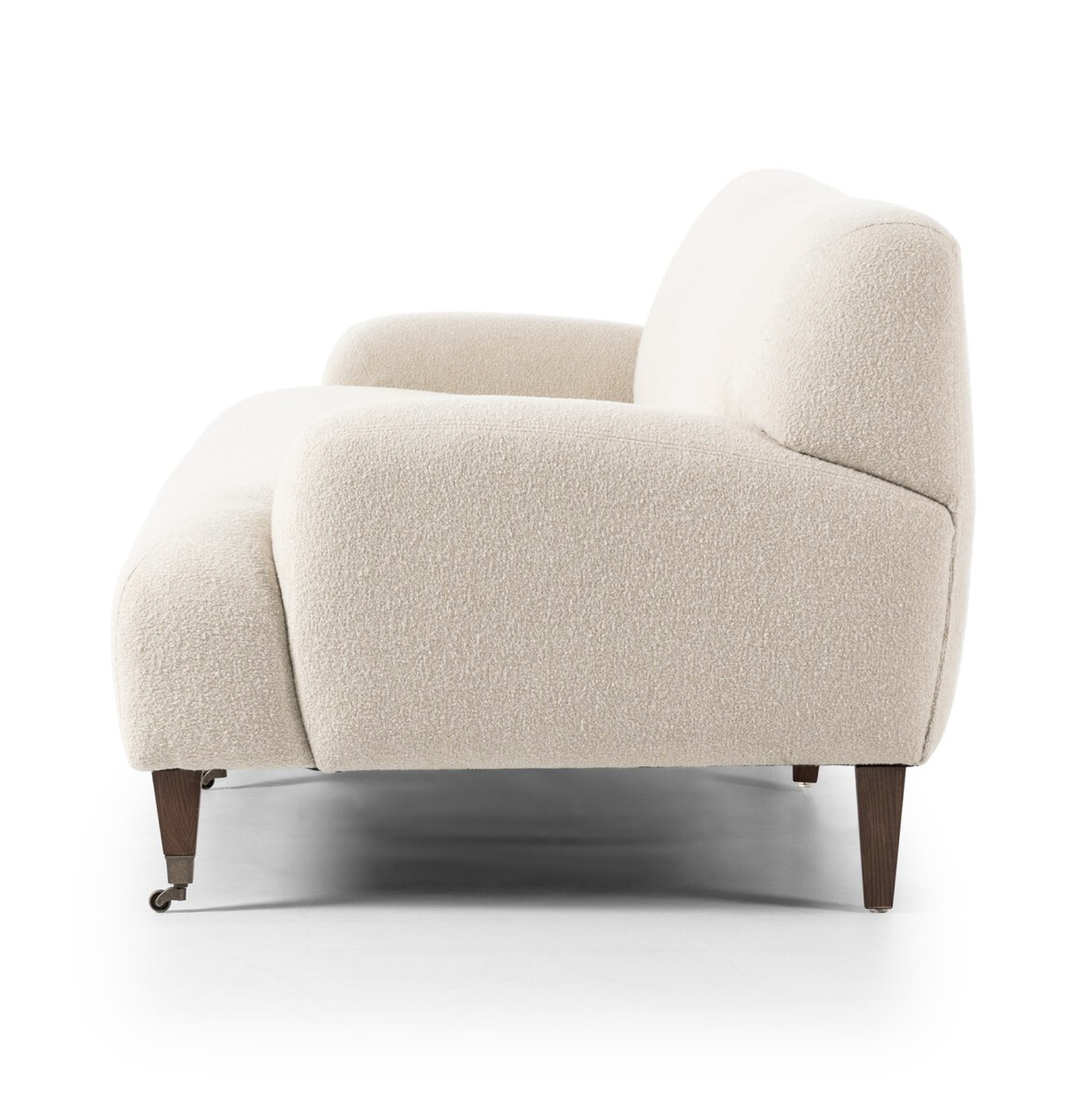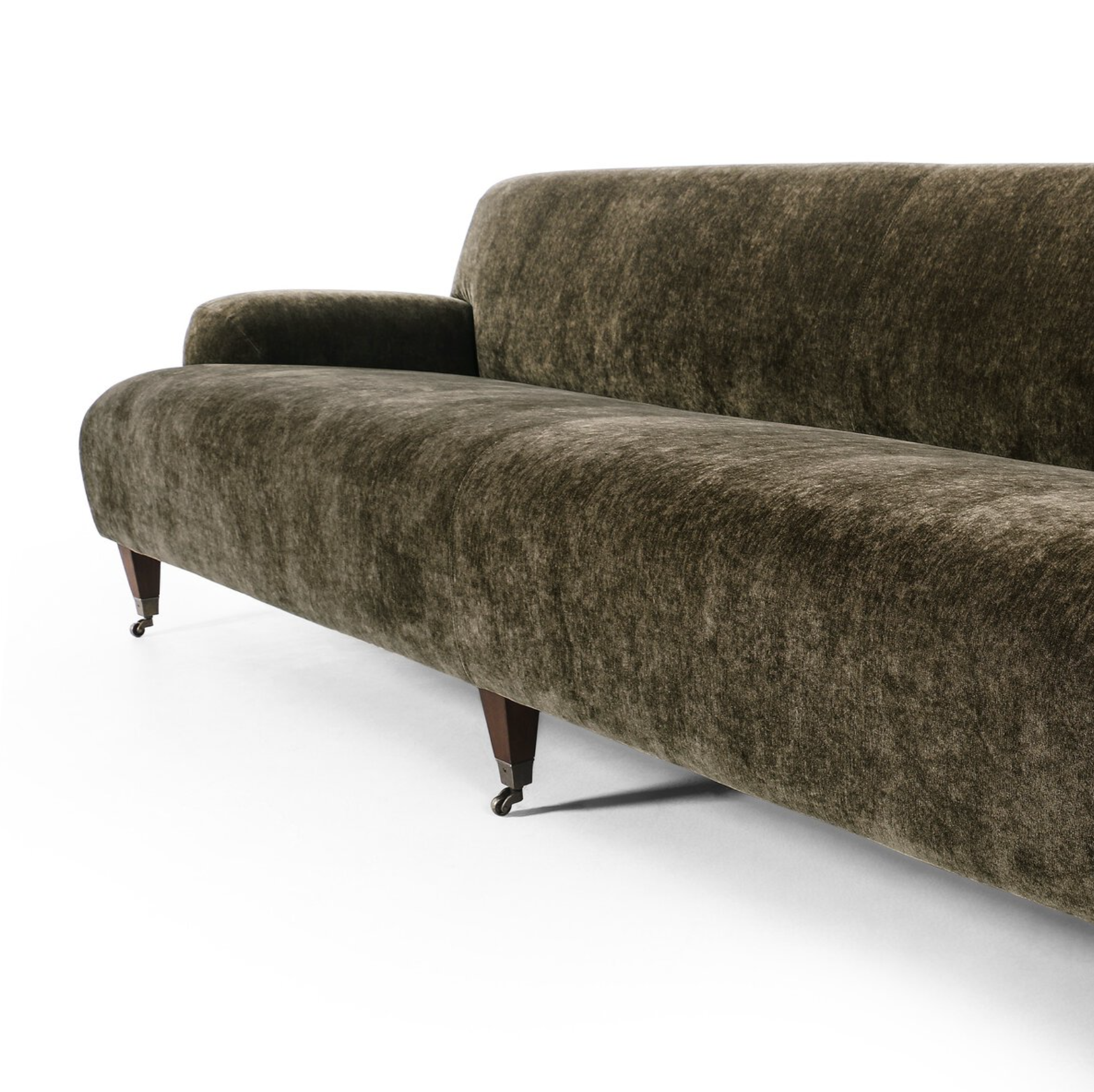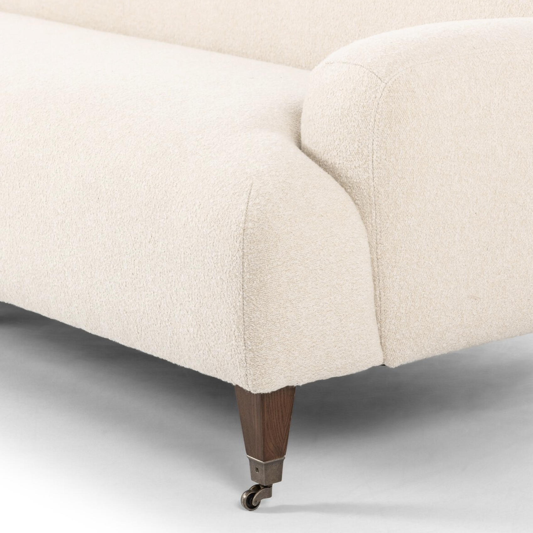 Le canapé Kent, fruit de la collaboration entre Amber Lewis et Four Hands, incarne l'élégance de la simplicité. Sa suspension à ressorts en S, associée à une assise de style banc, offre une expérience confortable et accueillante. Disponible en chenille recyclée ou en tissu classique, il souligne son profil raffiné et subtilement arrondi, complété par des roulettes en laiton sur les pieds avant.