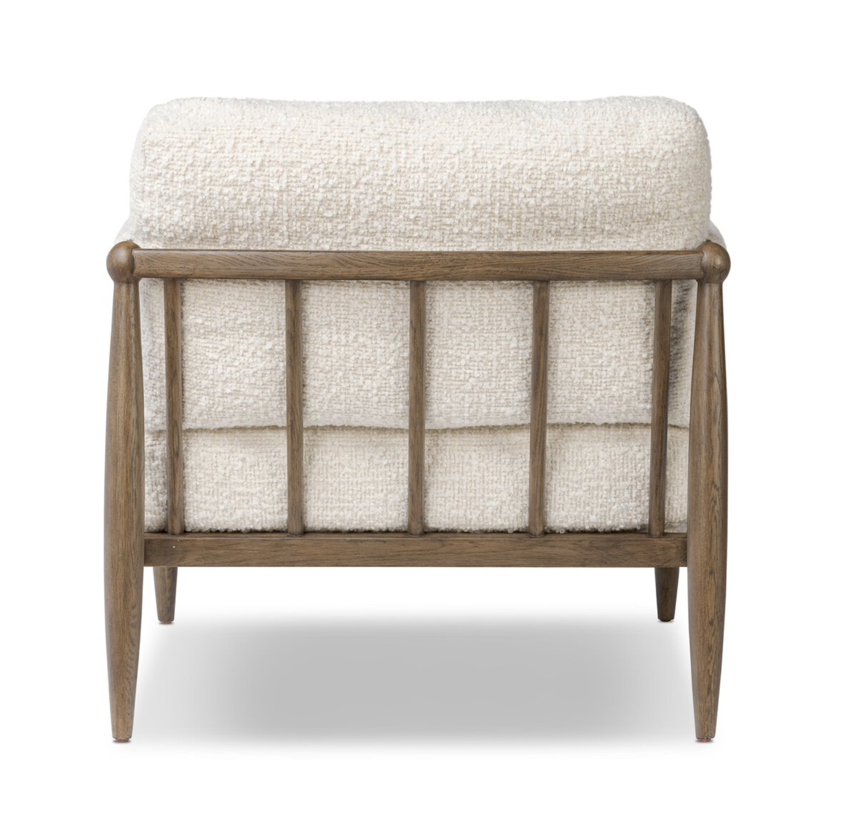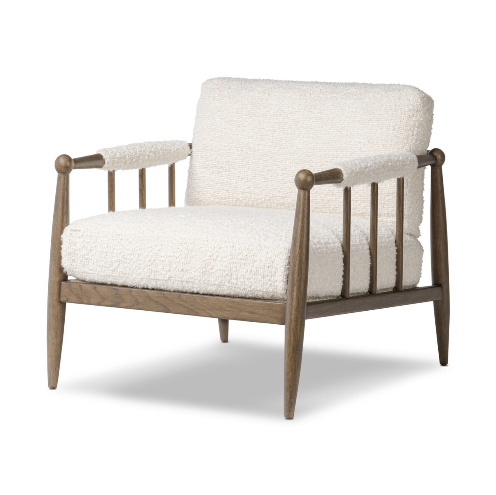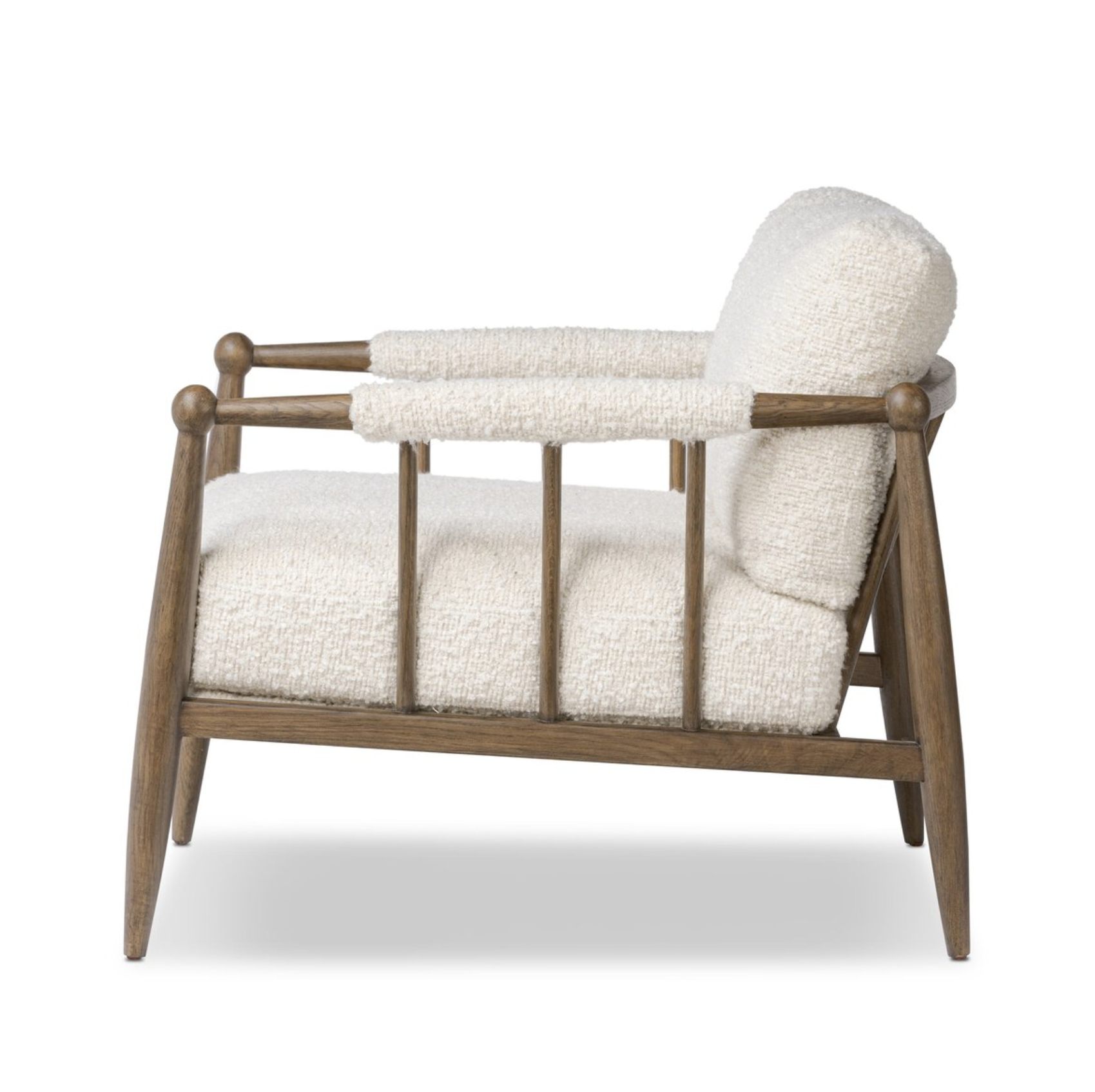 Fruit d'une collaboration entre Amber Lewis et Four Hands, le fauteuil Warren est disponible en tissu bouclé à poils longs ou en cuir pleine fleur. Ce fauteuil d'appoint arbore une silhouette classique revisitée avec une touche contemporaine : structure en chêne vieilli, pieds fuselés, barreaux le long des accoudoirs et détails ornementaux.