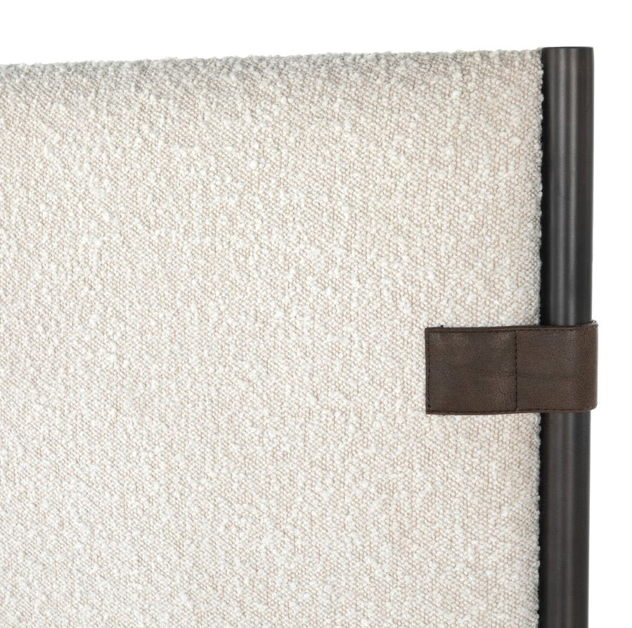 Le lit Anderson est revêtu d'un tissu bouclé traditionnel crème ou gris, orné de lanières de cuir décoratives pour une touche unique et raffinée. Sommier standard requis. Ce lit n'est pas compatible avec un matelas articulé.