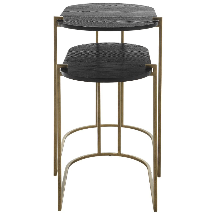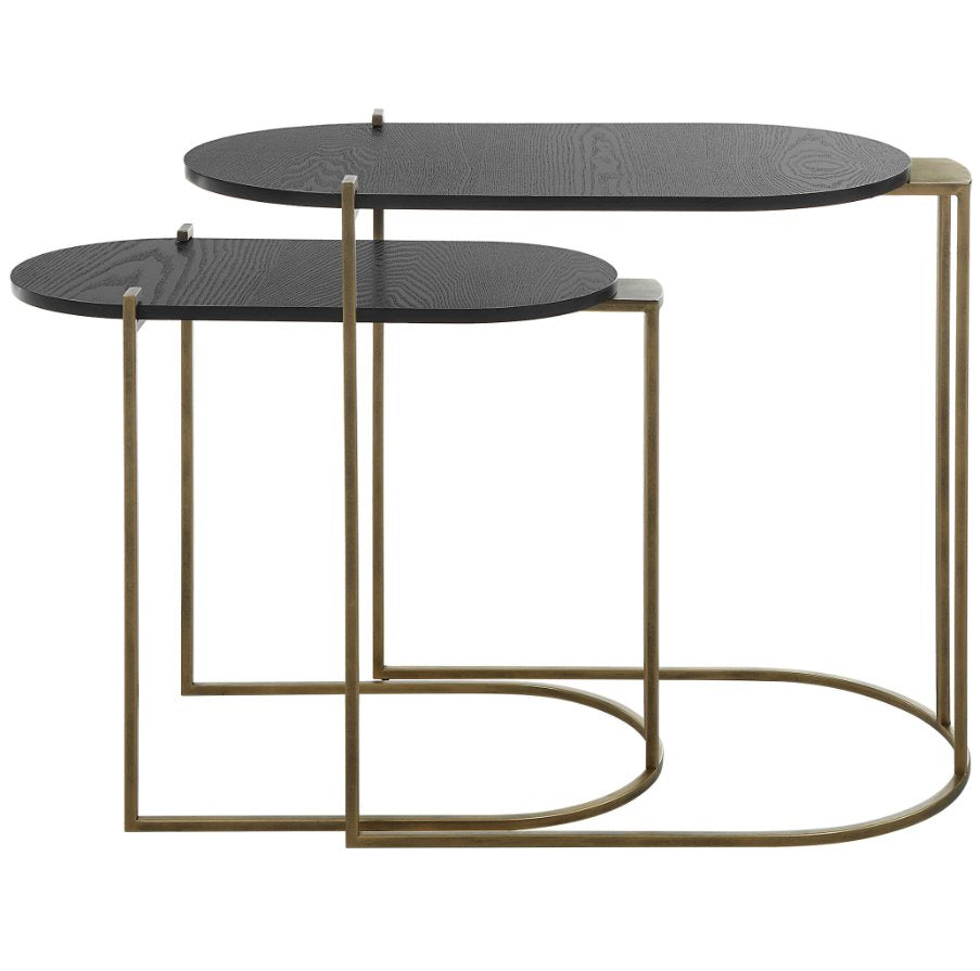 Mettez en valeur vos objets préférés ou utilisez-les comme table d'appoint avec les tables gigognes Aztec. Leur plateau en placage de frêne teinté ébène et leurs structures en fer laiton antique en font l'élément parfait pour sublimer tout espace de vie.