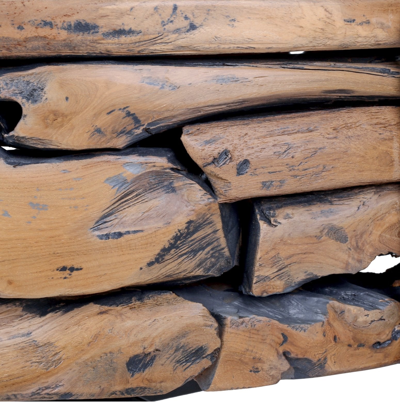 Un travail artisanal soigné donne naissance à une table basse en teck massif à bords naturels, réalisée à partir de racines de teck recyclées et empilées. Ses pieds en acier couleur canon de fusil s'harmonisent parfaitement avec son design rustique et moderne. Des patins en plastique assurent une sécurité et une stabilité accrues.