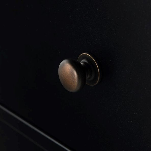 Le modèle Belmont est fabriqué en fer noir et forme une commode spacieuse à huit tiroirs, avec des poignées en bronze pour créer un contraste.
