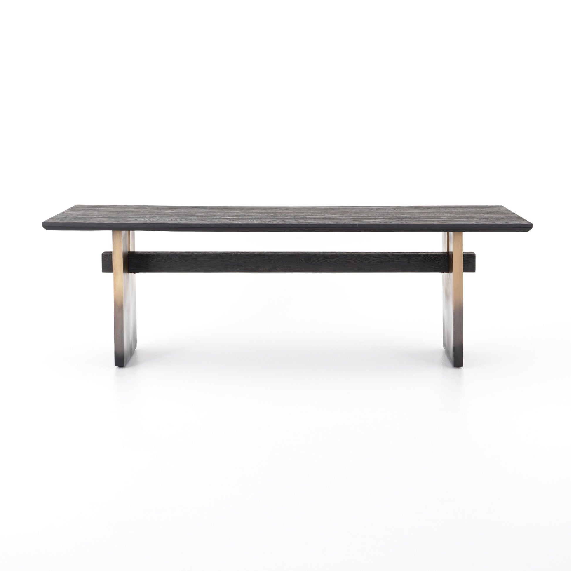 Les larges pieds en acier inoxydable finition laiton, de style planches, arborent un motif ombré du plus bel effet, rehaussé d'une traverse qui ajoute une touche d'originalité. Le plateau rectangulaire en chêne noir ou en chêne gris clair met en valeur le veinage naturel du bois, pour une ambiance chaleureuse et authentique.