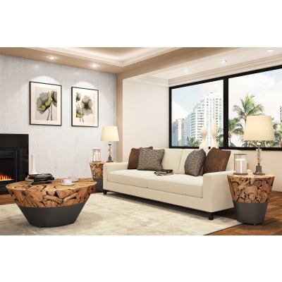 Fabriquée à partir de racines de teck recyclées et soutenue par un piètement en acier laqué noir, cette table basse ronde est visuellement agréable et unique.