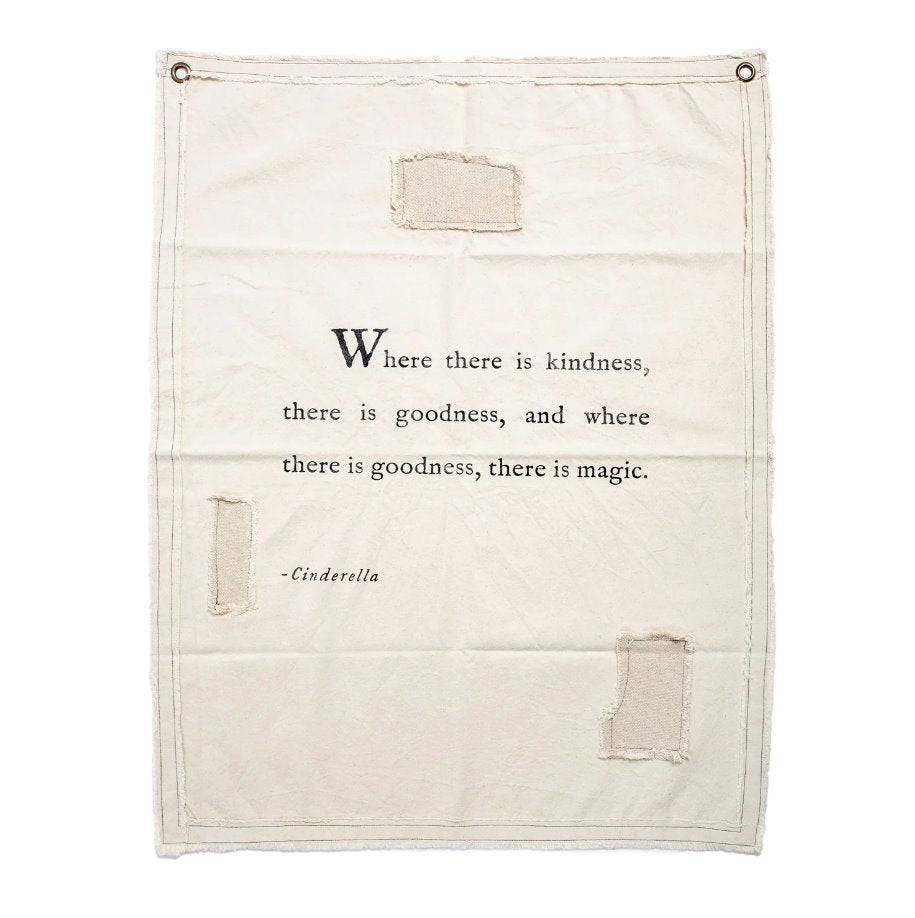 Confectionnée entièrement en coton et prélavée pour un effet vintage, cette tenture murale en toile présente un aspect vieilli avec des empiècements cousus à la main et des bords effilochés. Les citations sont imprimées avec soin sur la toile et chaque tenture est ornée de surpiqûres.