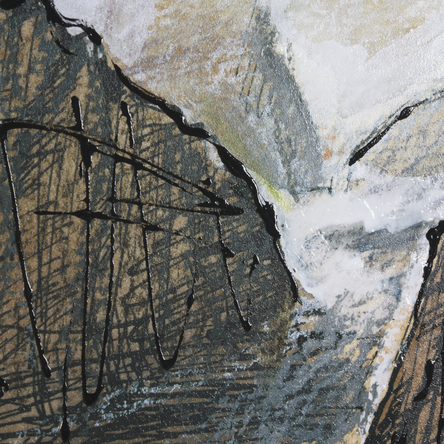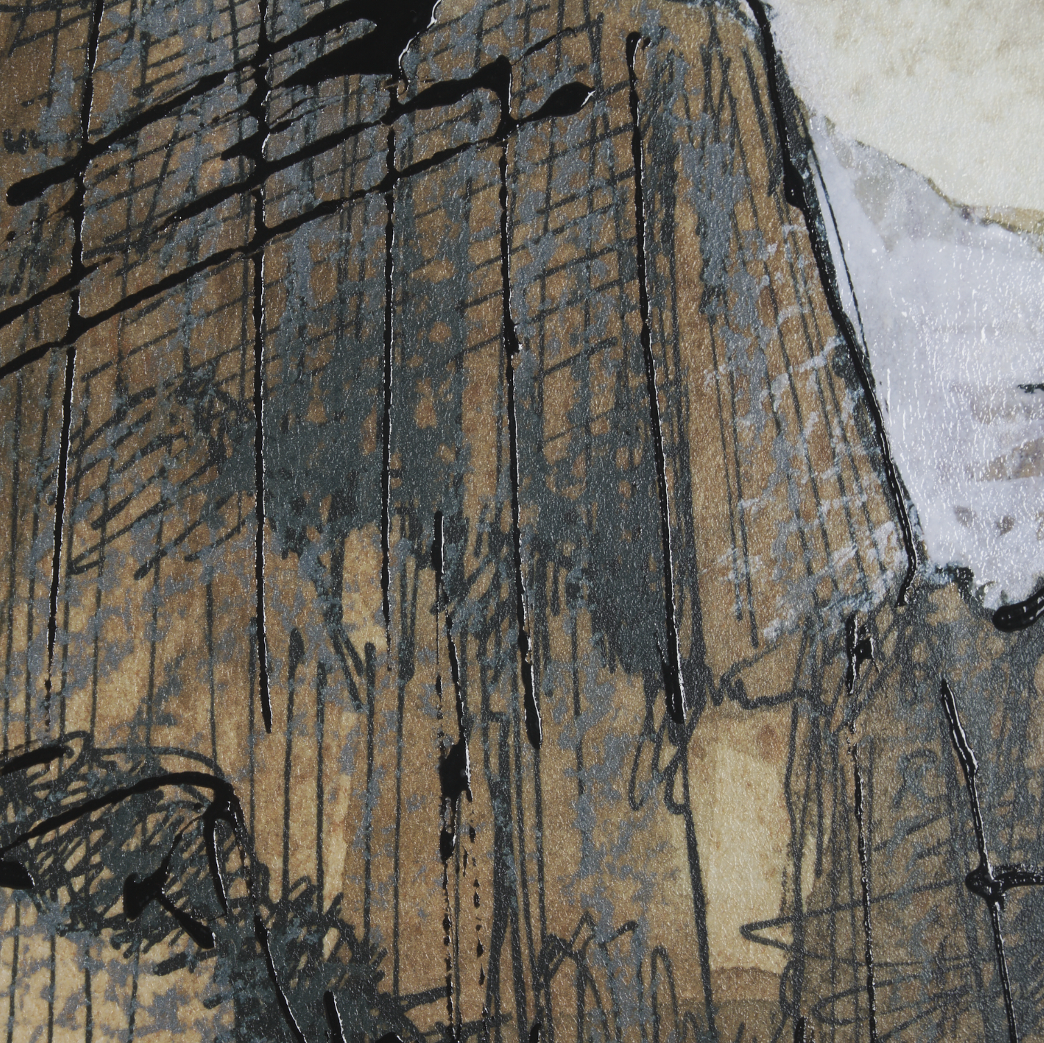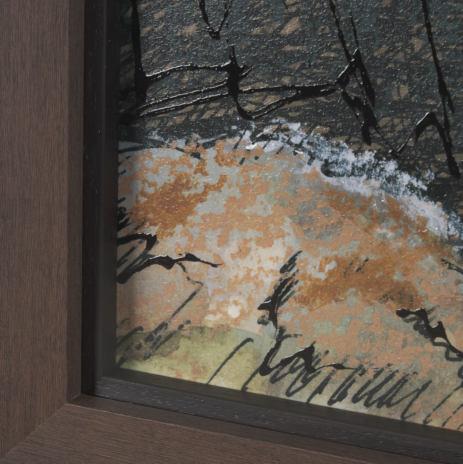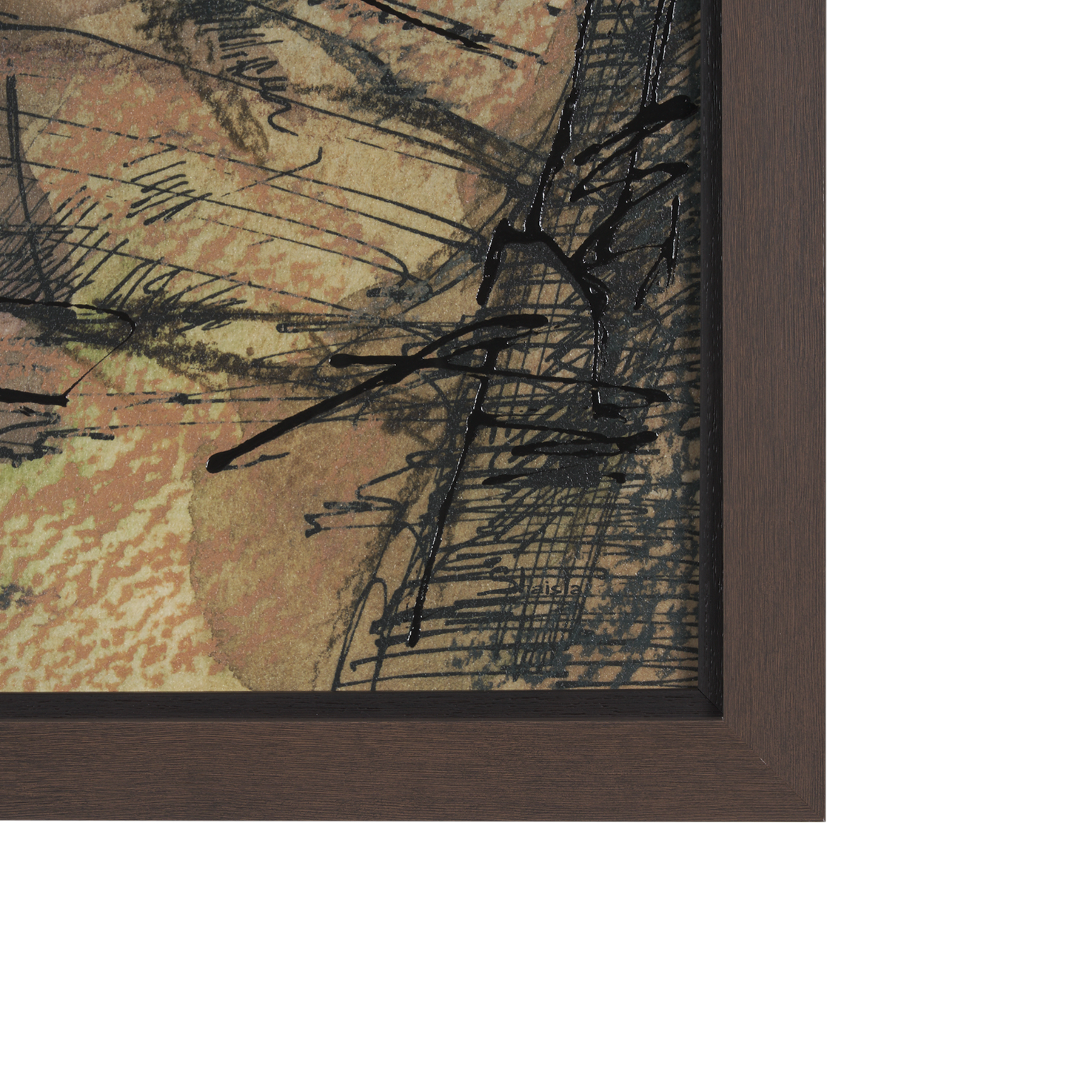 Cette estampe, inspirée du design du milieu du XXe siècle, représente un canyon abstrait orné de textures. Son élégant cadre brun met en valeur les nuances de couleurs de l'œuvre.