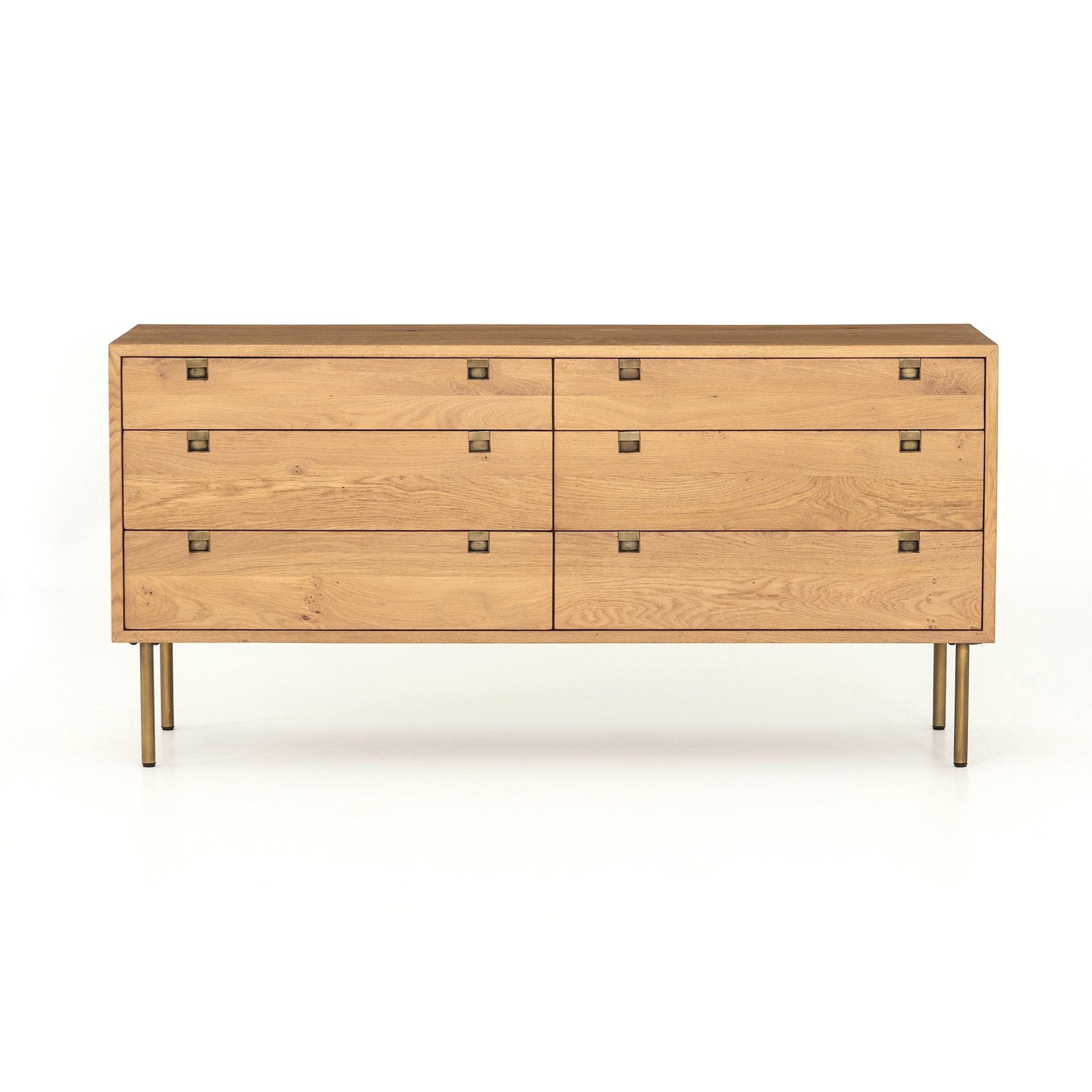 Ces commodes d'inspiration danoise sont dotées de tiroirs avec poignées en laiton encastrées assorties aux pieds en métal et offrent un grand espace de rangement pour la chambre. Complétez le style de votre chambre avec d'autres meubles de notre collection Carlisle.