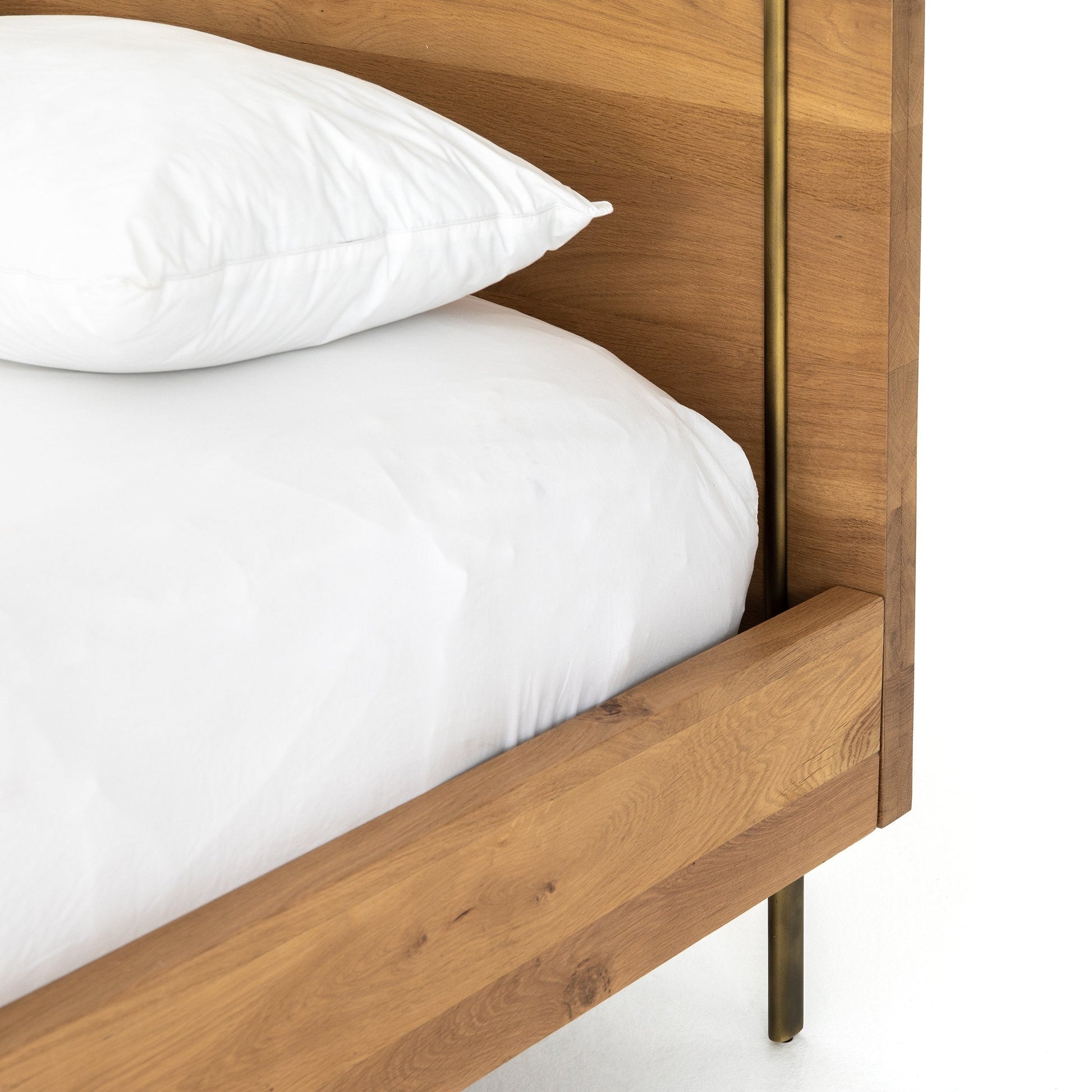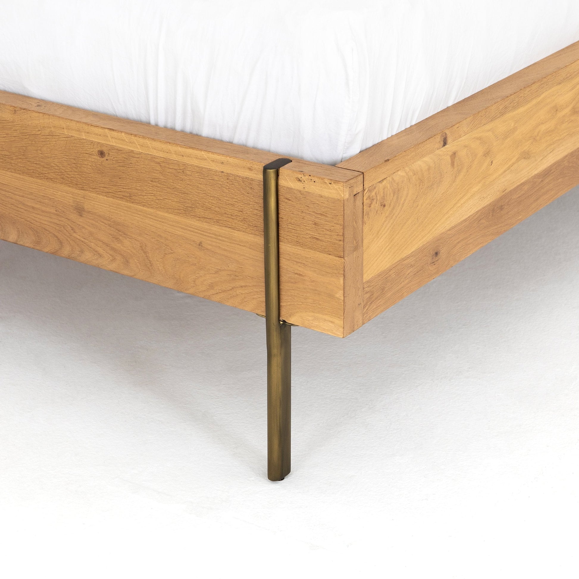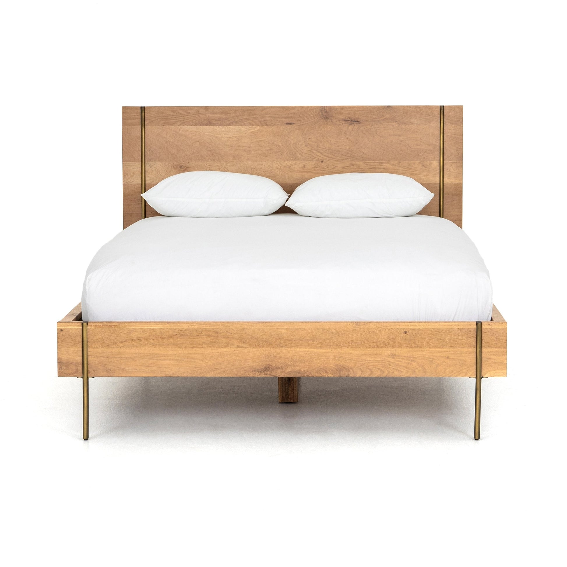 Les incrustations linéaires en laiton sur la tête et le pied de lit rehaussent le design simple et carré de ce lit. Lit plateforme, sommier non requis. Ce lit fait partie de la collection de meubles Carlisle , qui comprend d'autres meubles de chambre, tels que des tables de chevet et des commodes.