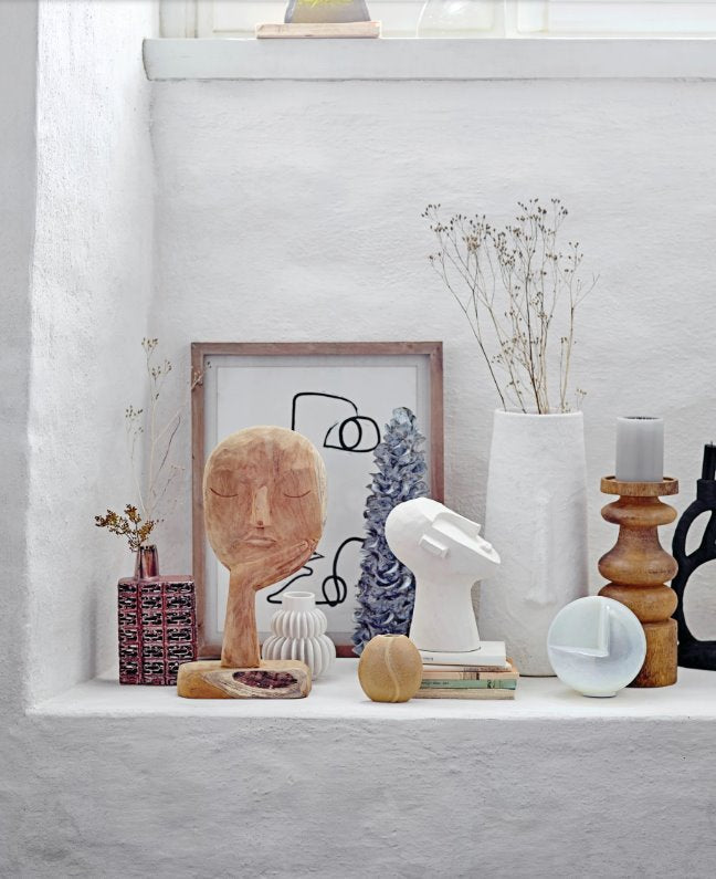 Sculpture en bois sculpté représentant un visage reposant sur une main