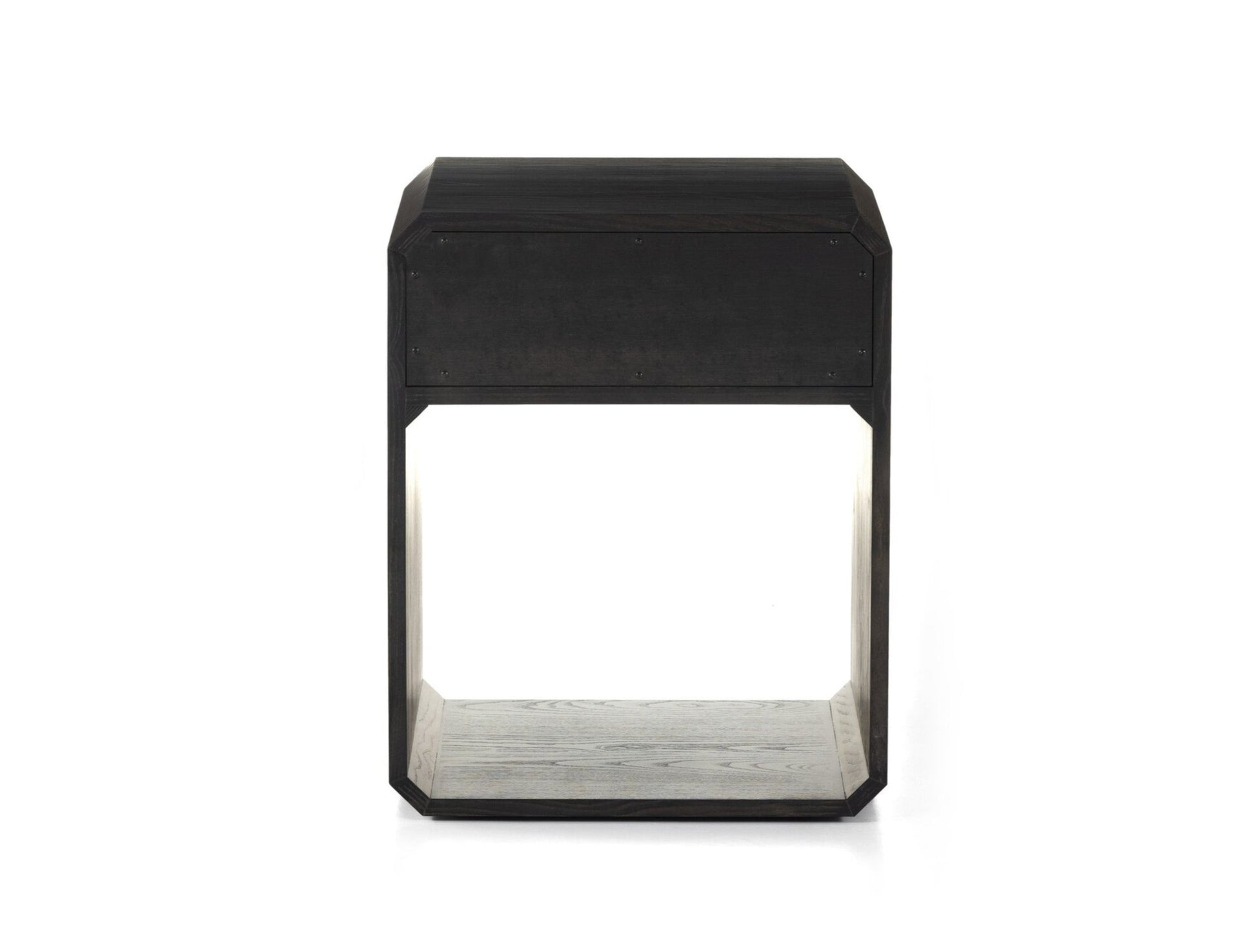 La table de chevet Caspian présente un élégant placage en frêne noir et un design octogonal moderne. Dotée d'un tiroir coulissant à la finition texturée et aux poignées en laiton satiné, elle offre des espaces de rangement à la fois dissimulés et apparents, tout en occupant un minimum d'espace.