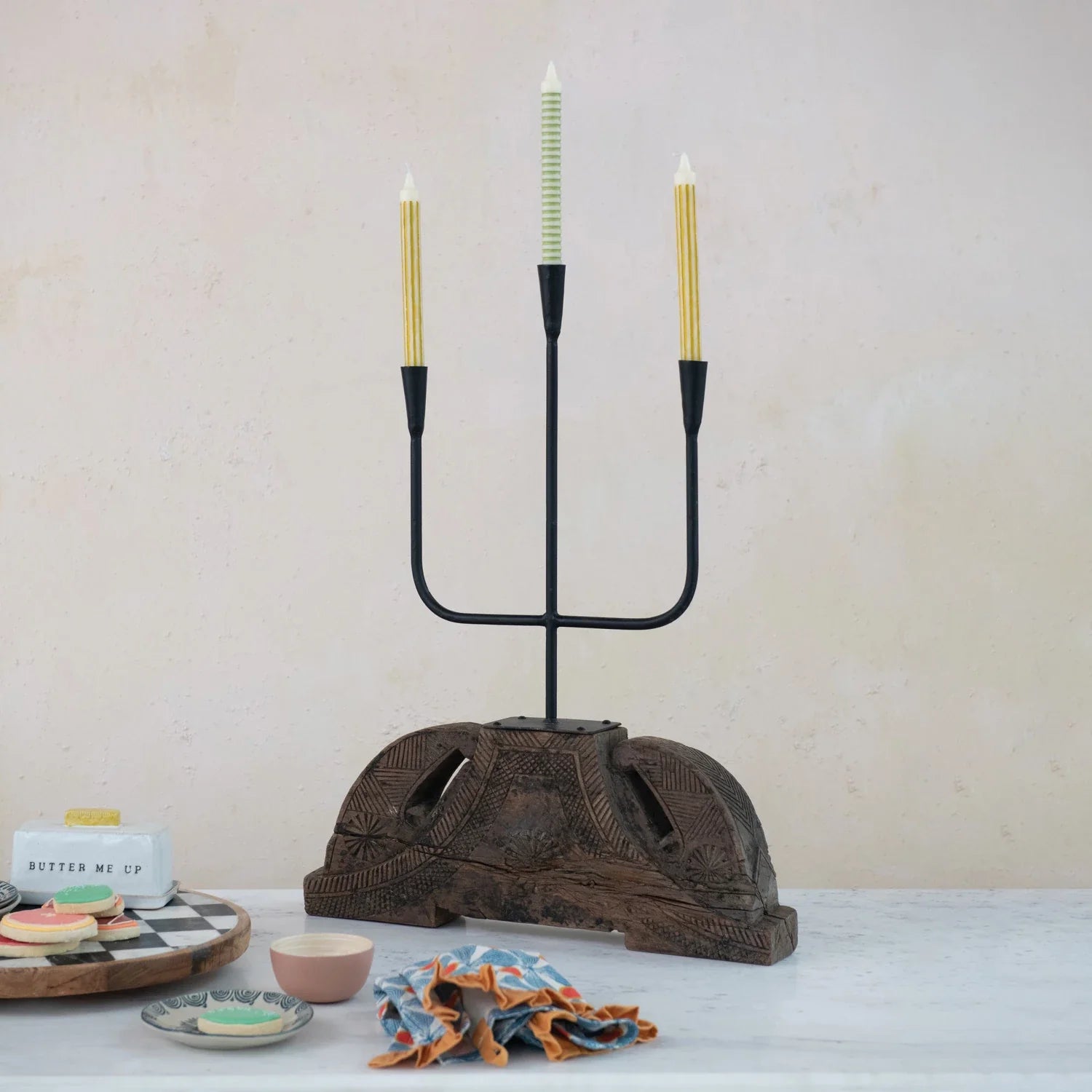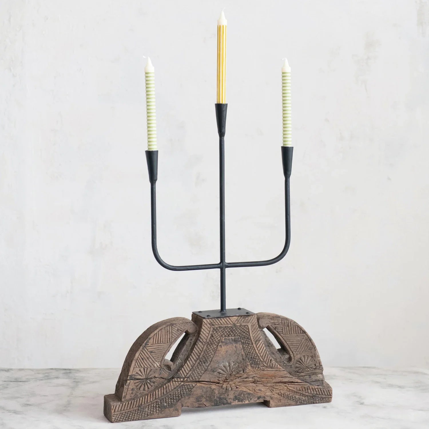 Cette pièce sculpturale allie des porte-bougies minimalistes en fer à un socle en bois richement ouvragé. Une belle façon d'ajouter de la hauteur et du cachet à une table, une cheminée ou une étagère.