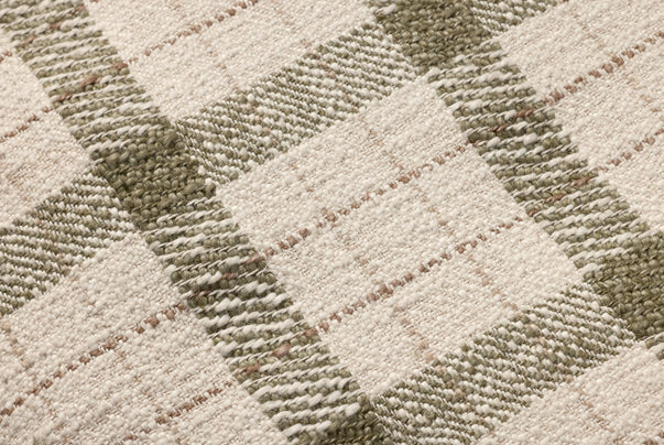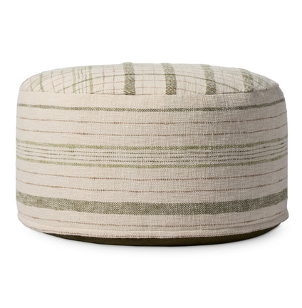 Ce pouf rond polyvalent arbore un motif à carreaux tissé couleur crème avec des touches de vert, apportant une touche de texture à n'importe quel espace.