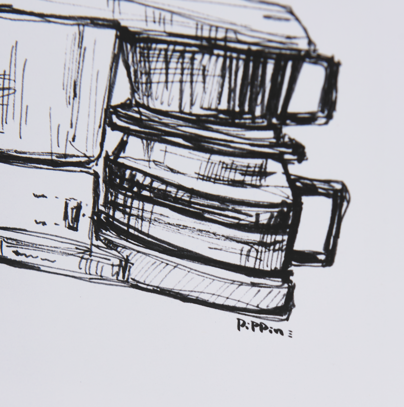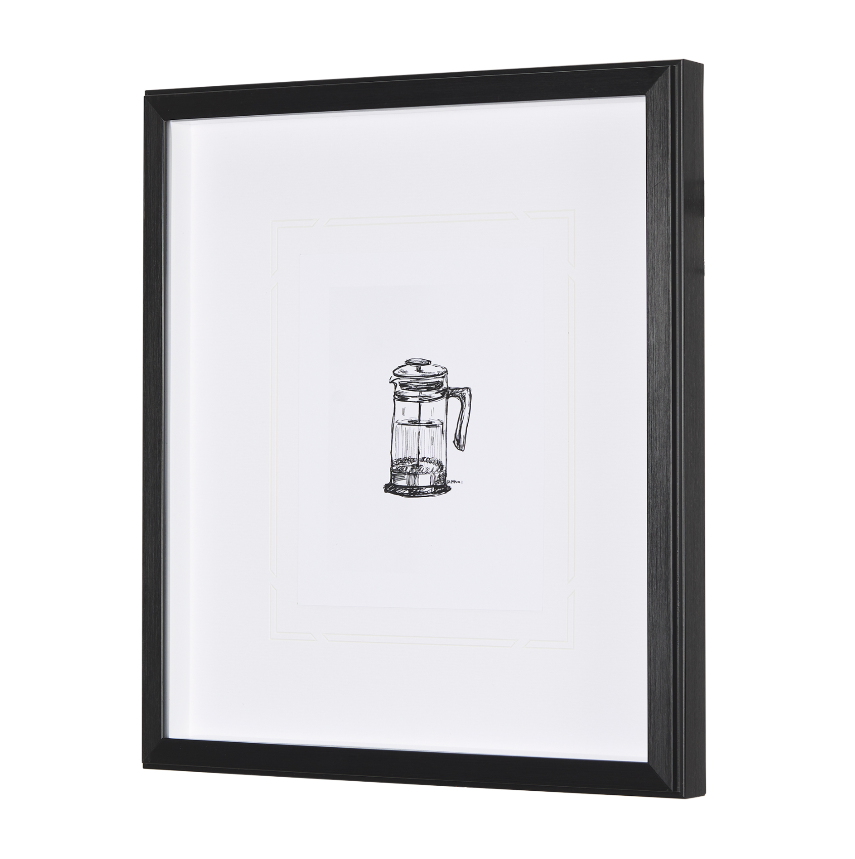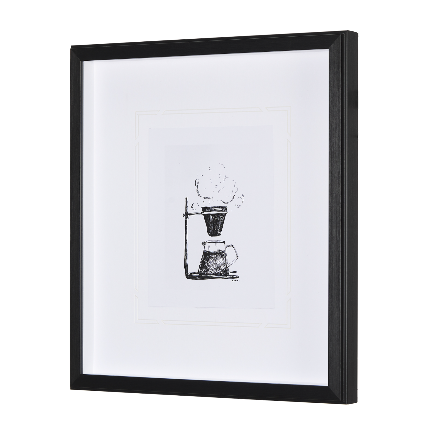 La collection Café présente des dessins à l'encre détaillés illustrant différentes méthodes d'infusion sur un fond blanc éclatant. Ces œuvres monochromes et minimalistes mettent en valeur des lignes épurées et des contrastes saisissants. Chaque estampe est encadrée et finie à la main pour rehausser la texture et la profondeur.