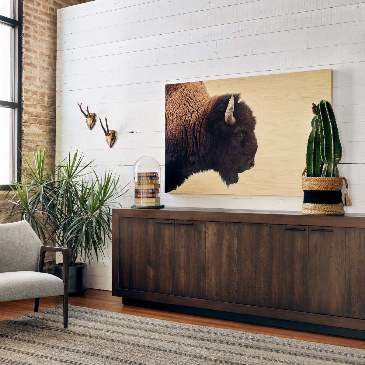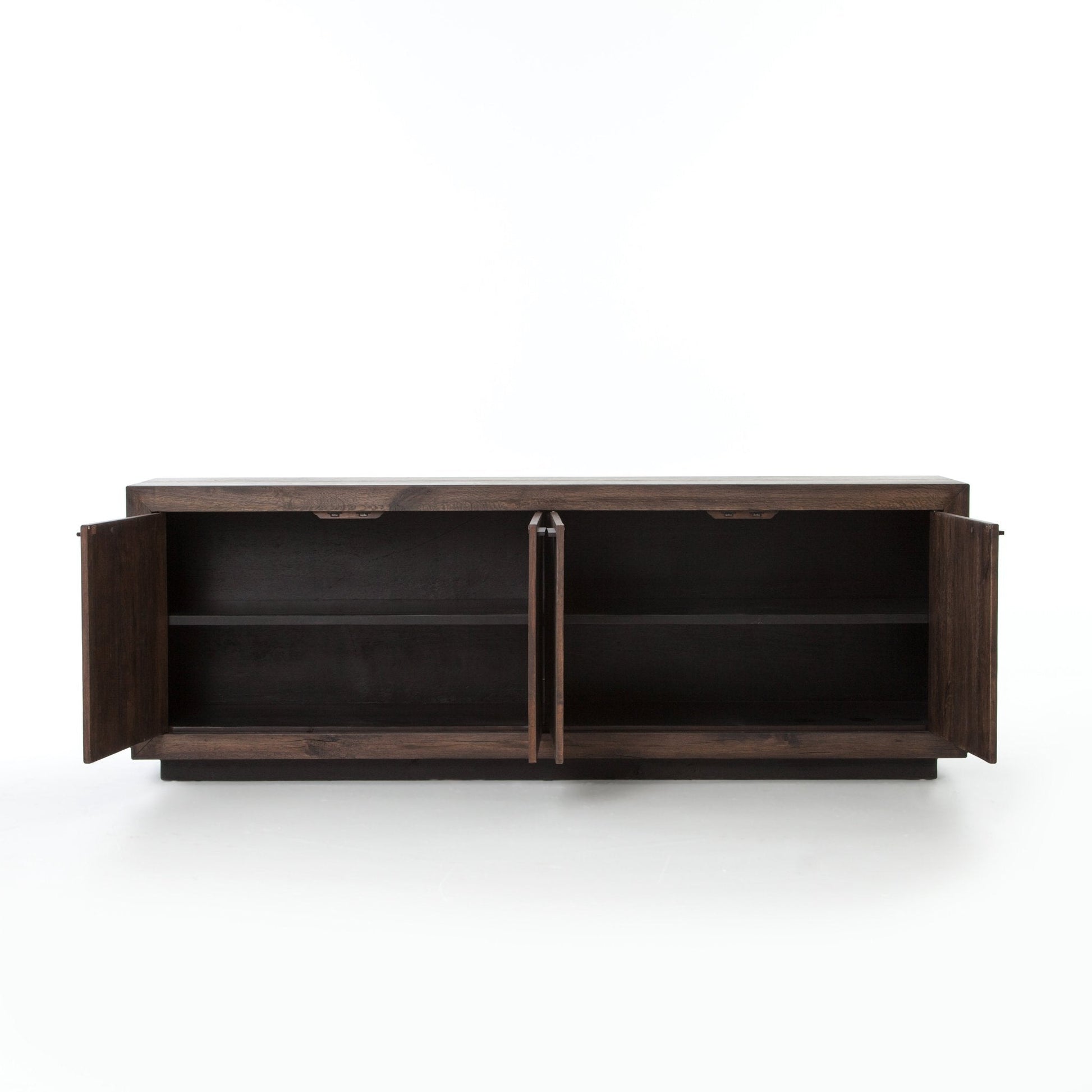 Reposant sur un socle, le buffet Couric est doté de quatre portes, de nombreux rangements et de poignées en fer forgé aux lignes épurées. Fabriqué en chêne recyclé issu de forêts gérées durablement.