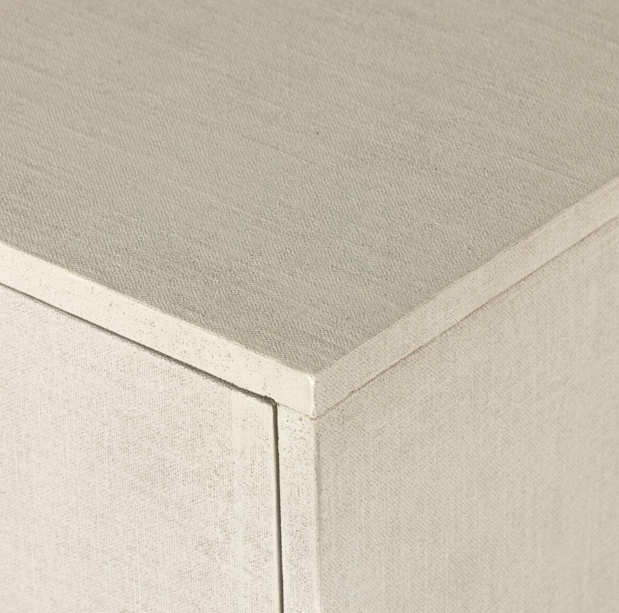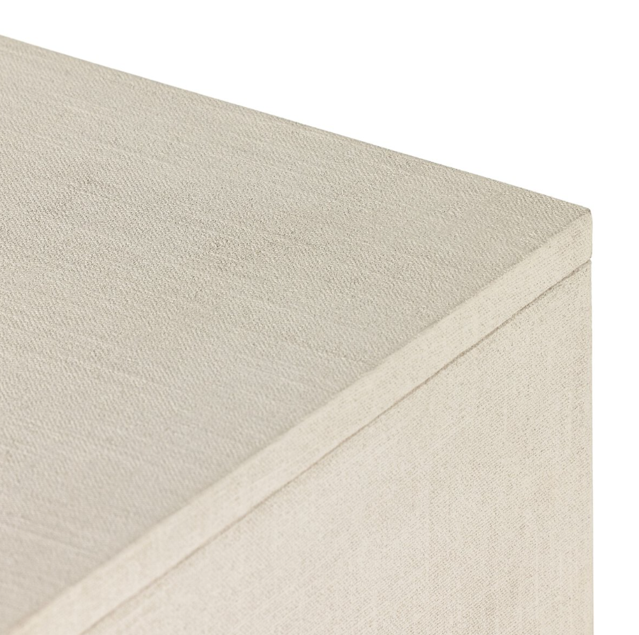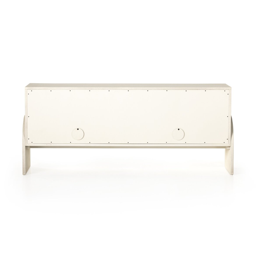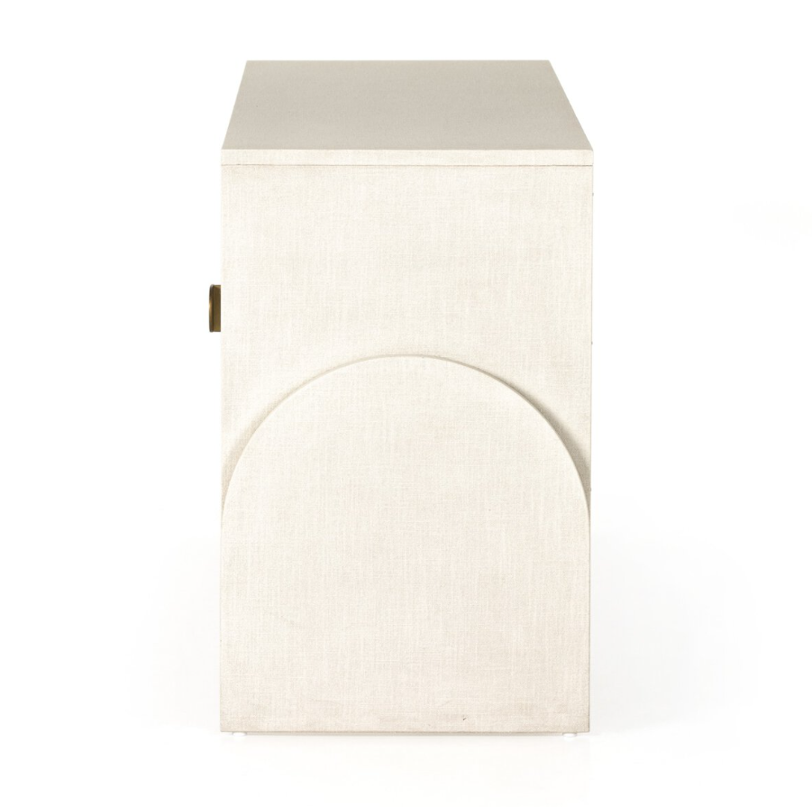Le buffet Cressida est confectionné en lin peint couleur ivoire clair et présente des pieds arqués qui adoucissent ses lignes épurées. Il est orné de poignées en demi-lune finition laiton antique et de deux ouvertures à l'arrière pour le passage des câbles.