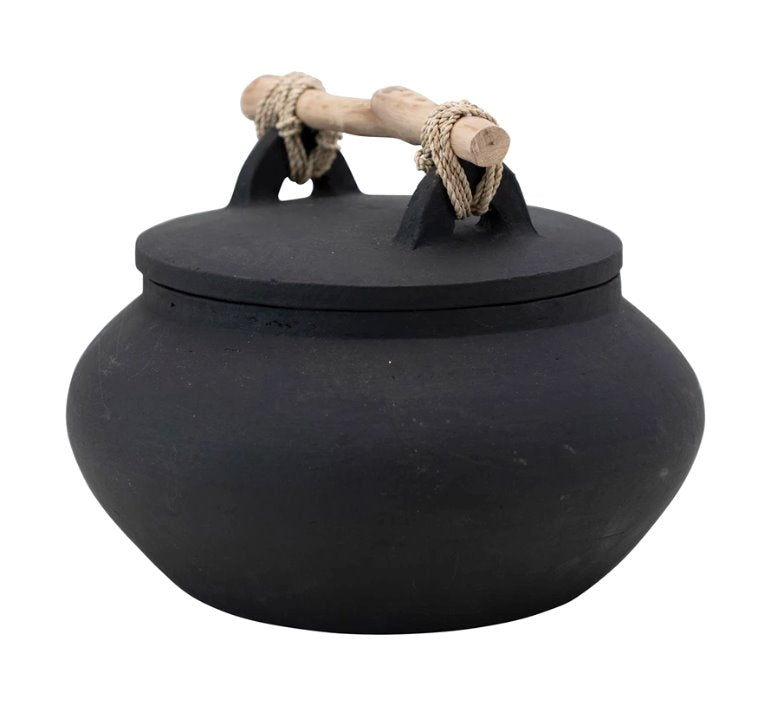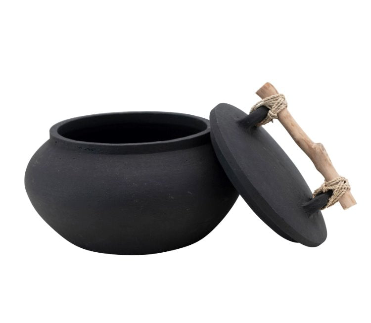 Ce pot en terre cuite noire mate, doté d'une poignée en bois flotté naturel, est l'objet de décoration parfait pour le collectionneur de bibelots.