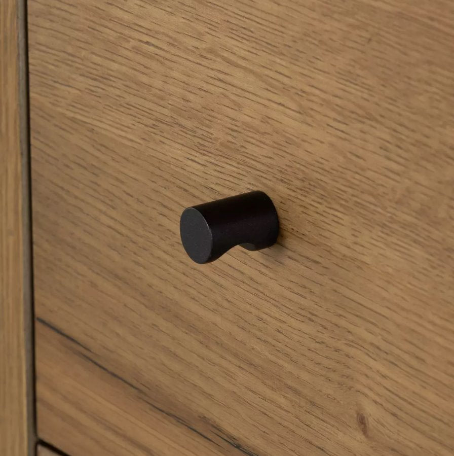 Épuré et moderne, ce meuble, fini en chêne clair ou ambré, est doté de trois tiroirs et de poignées en métal canon de fusil, pour un style intemporel. La résine foncée met en valeur le grain naturel du bois, lui conférant texture et authenticité.