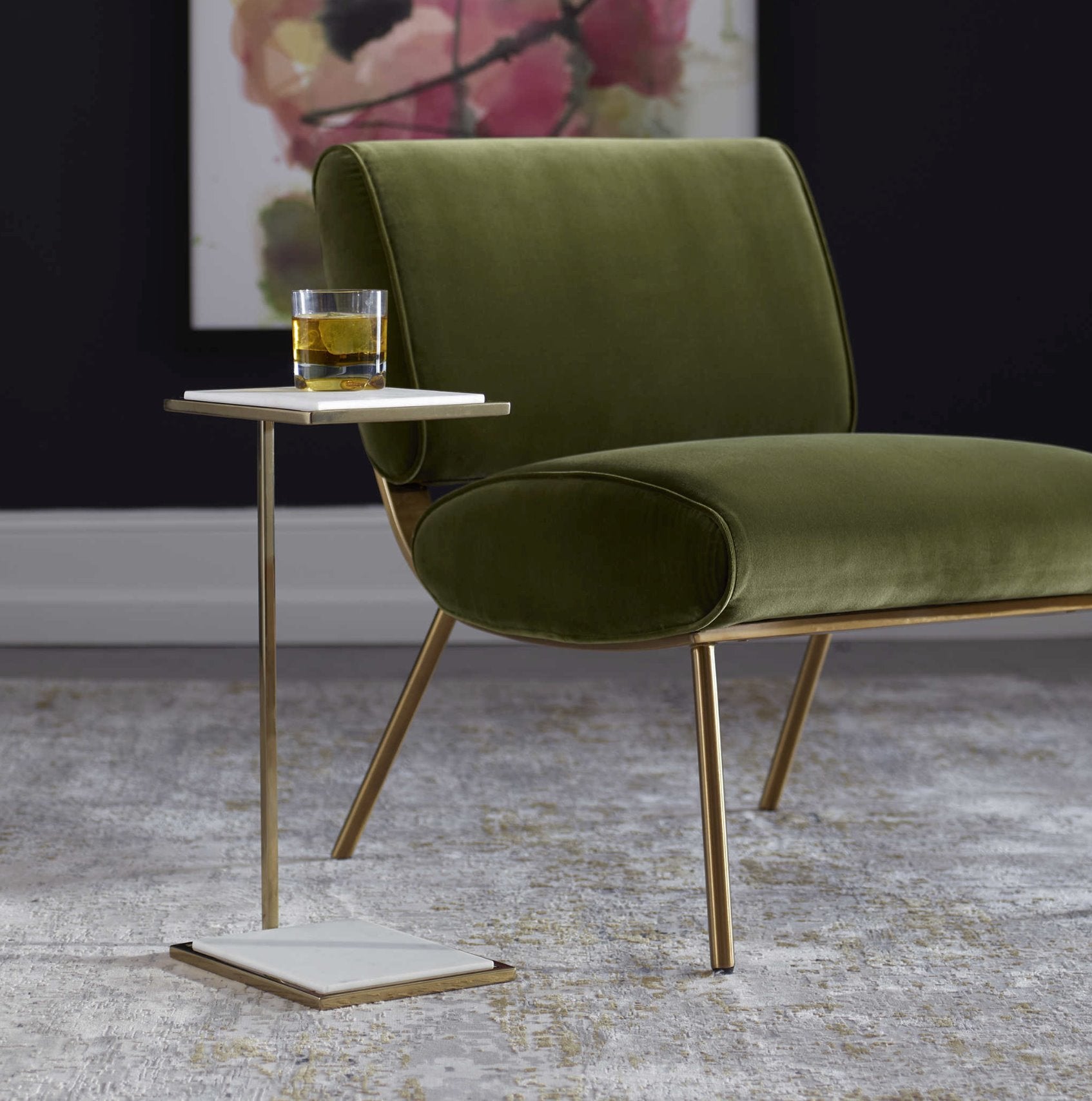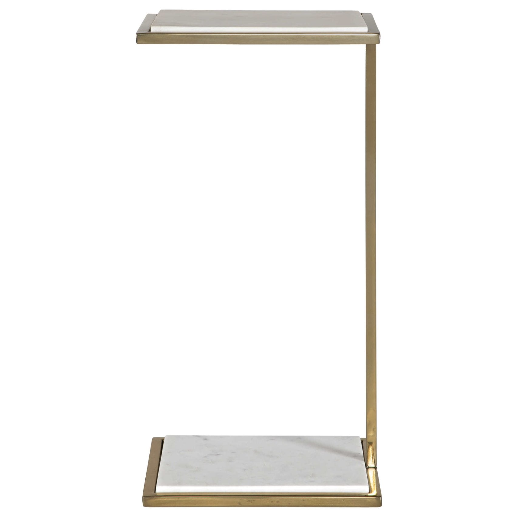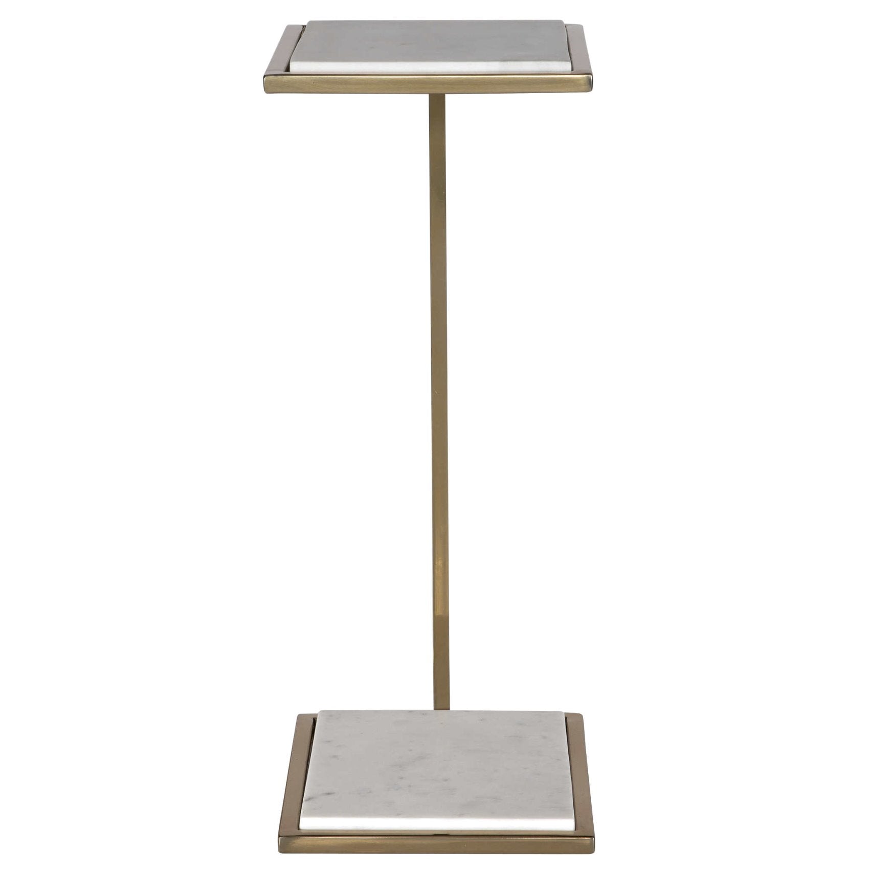 La table basse Elevate offre une surface idéale pour poser et savourer une boisson, avec un plateau et un socle en marbre blanc poli, enchâssés dans une structure en acier inoxydable plaqué laiton brossé.
