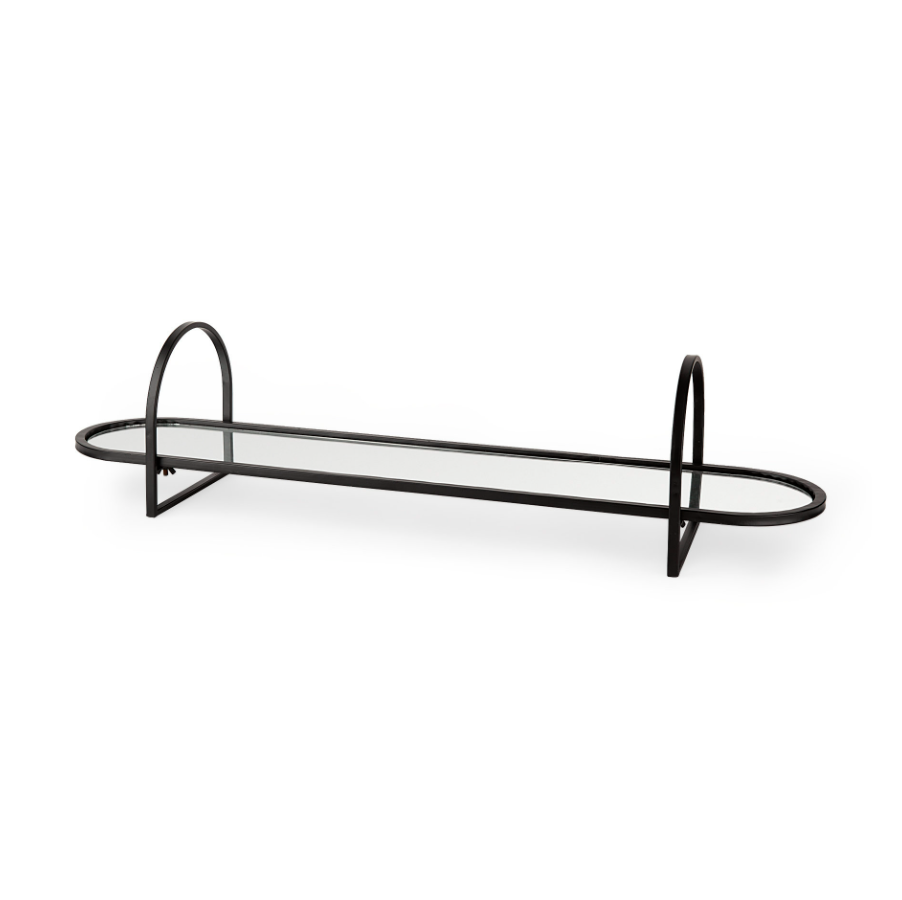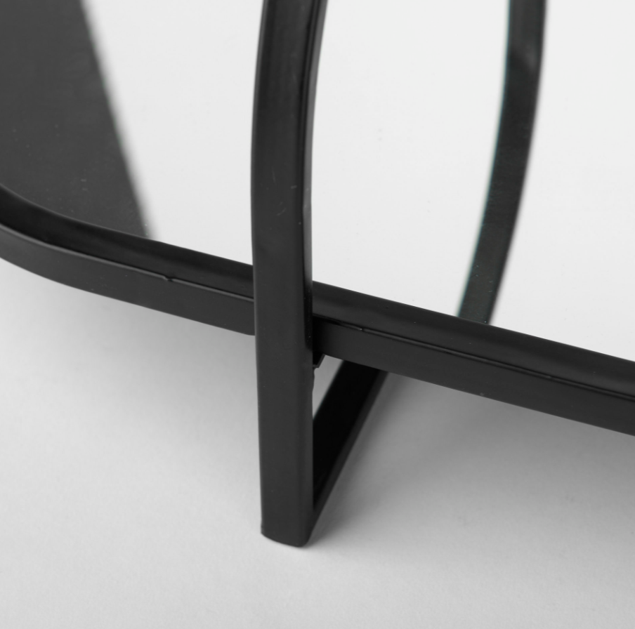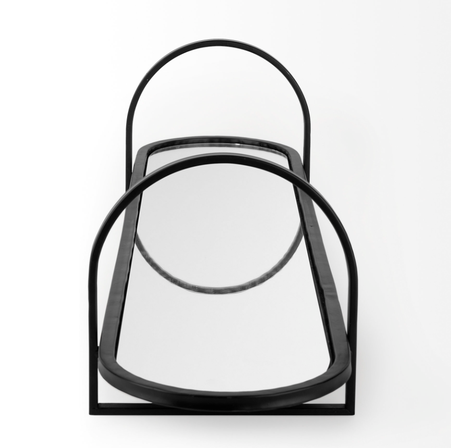 Le plateau Evianna offre un design élégant pour le plan de travail, avec une surface rectangulaire en miroir aux angles arrondis. Encadré d'un fin liseré métallique et doté de deux poignées arquées en fer, il allie fonctionnalité et style raffiné.