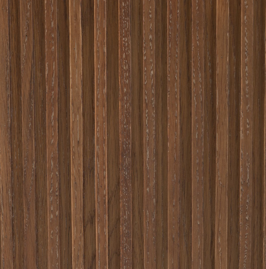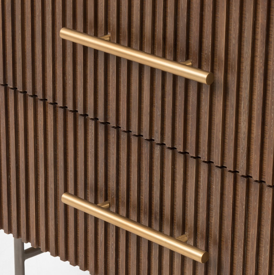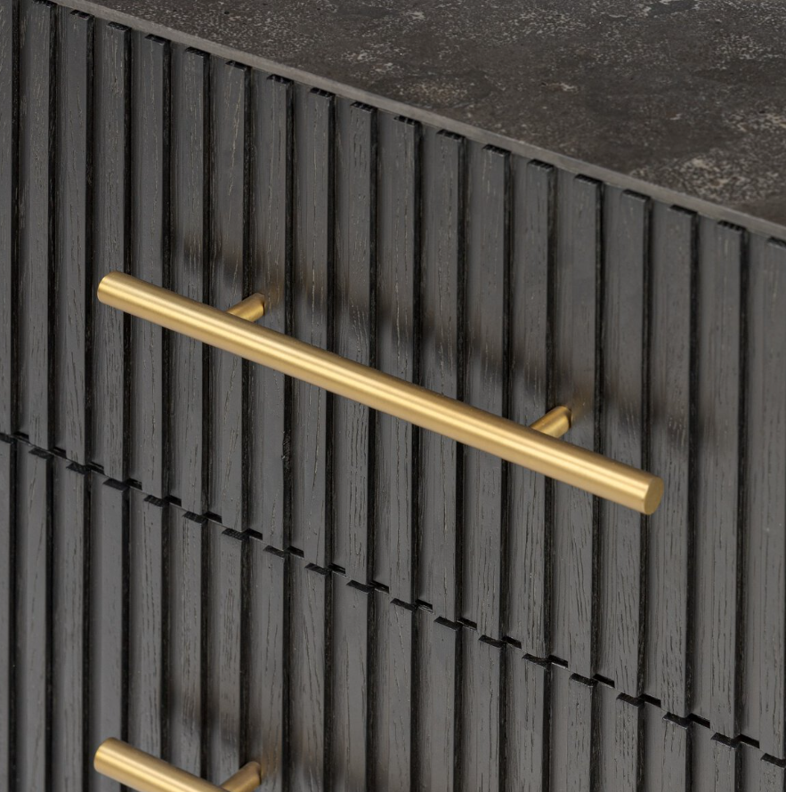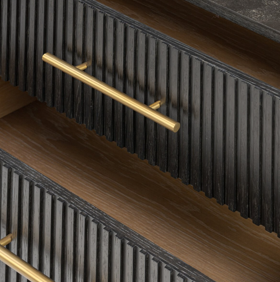 Fabriquée en chêne massif avec un plateau en pierre bleue, la table de chevet Fletcher arbore deux tiroirs spacieux avec des ferrures en laiton poli, des coins arrondis et des cannelures pour une texture remarquable.