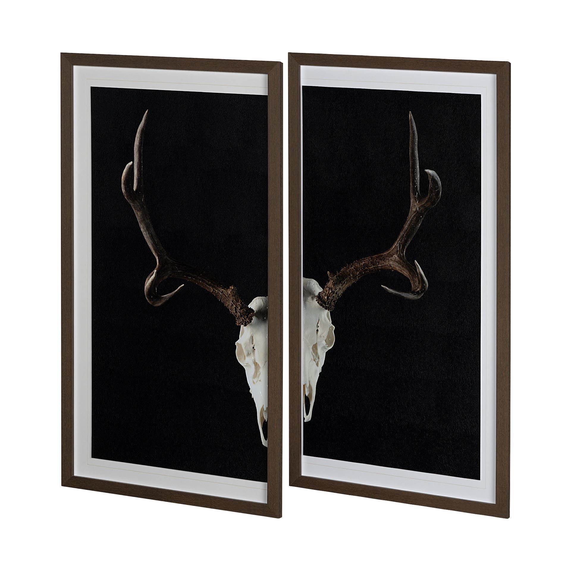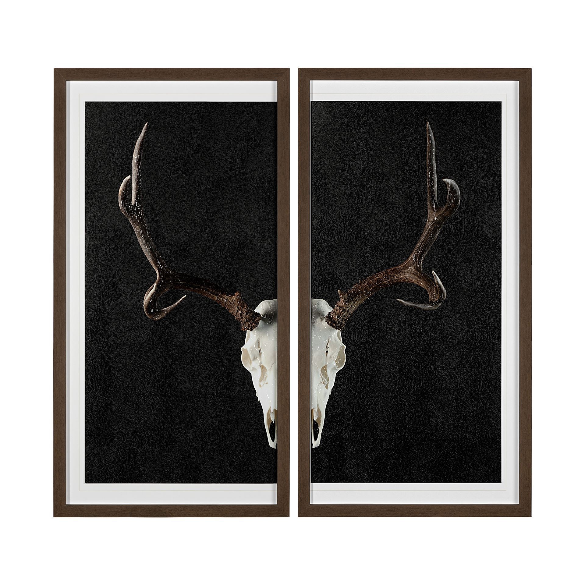 Un magnifique diptyque photographique encadré représentant un grand crâne de cerf. Une décoration murale idéale pour habiller des murs nus et affirmer un style fort. Vendu par lot de 2.