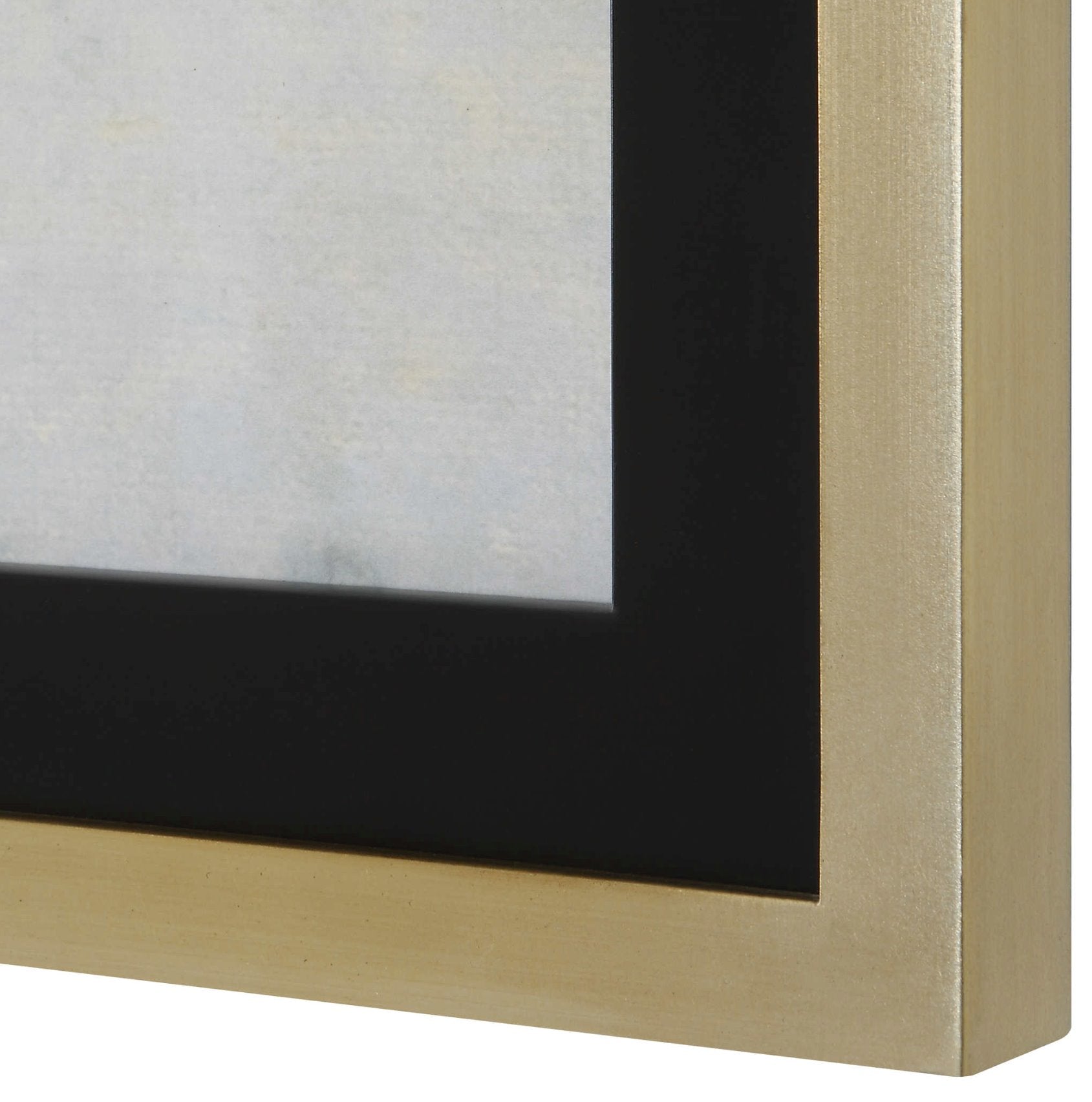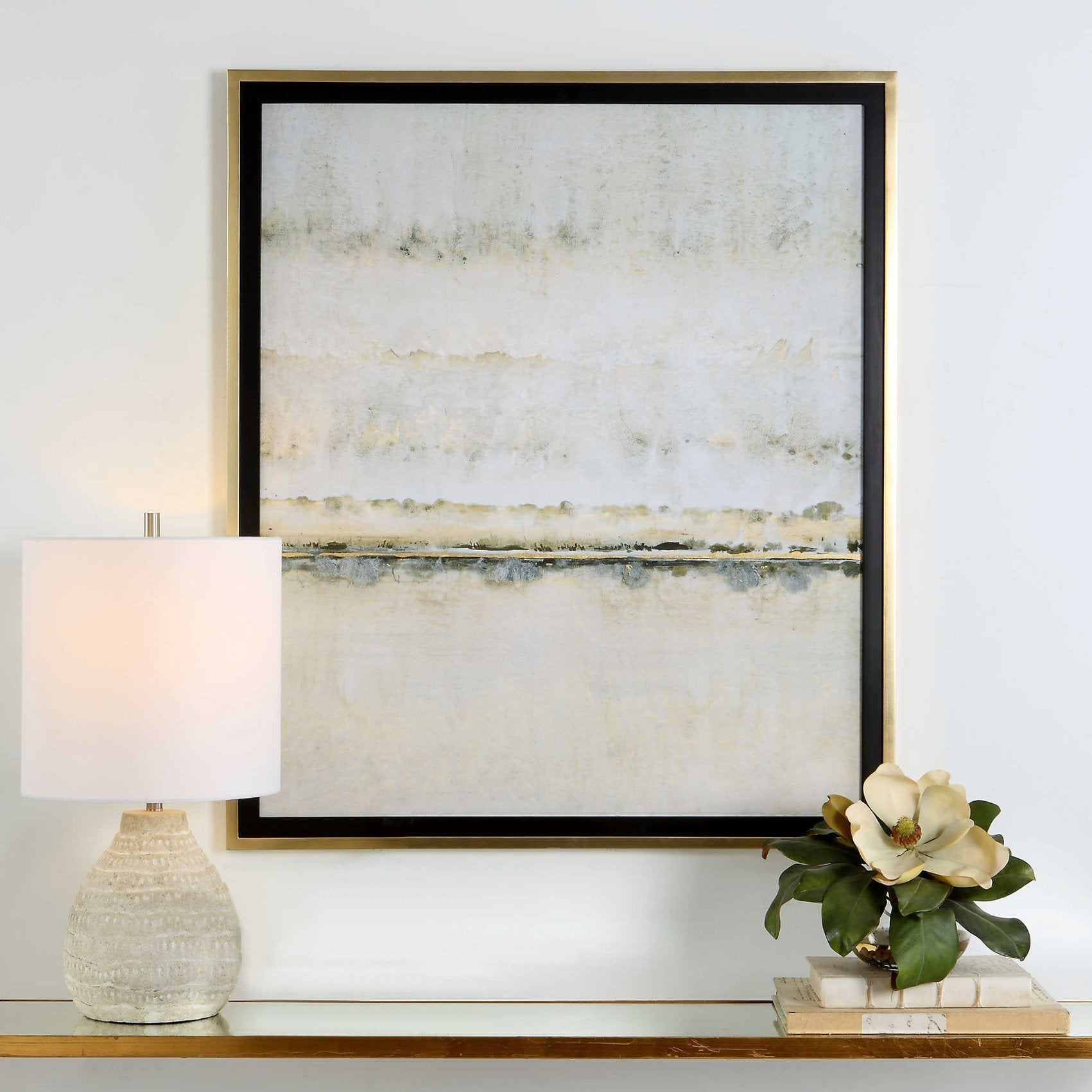L'œuvre « Horizon doré » de Tim O'Toole représente un paysage abstrait et met en valeur une palette de couleurs neutres et variées, rehaussée de détails en feuille d'or. Le cadre en feuille d'or antique, souligné par un élégant passepoil noir, sublime l'estampe.
