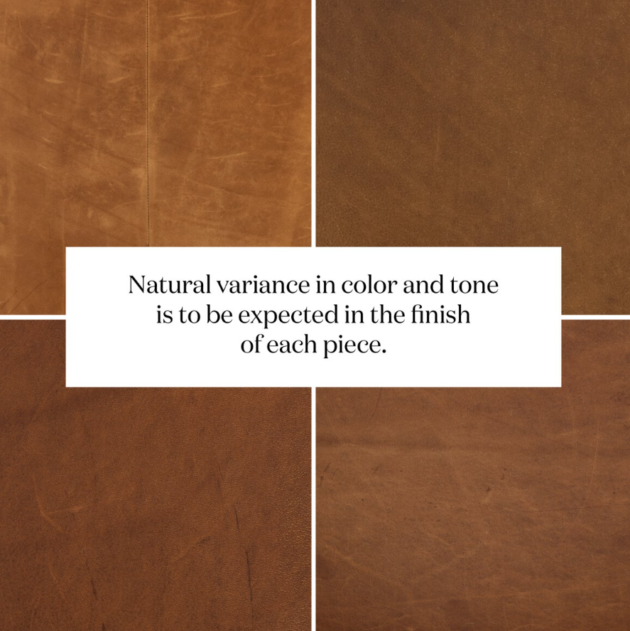 Le pouf Halston est confectionné à partir d'un cuir recyclé présentant des marques naturelles, des cicatrices et des variations de couleur. Il est orné d'un capitonnage raffiné, encadré d'une structure en frêne.
