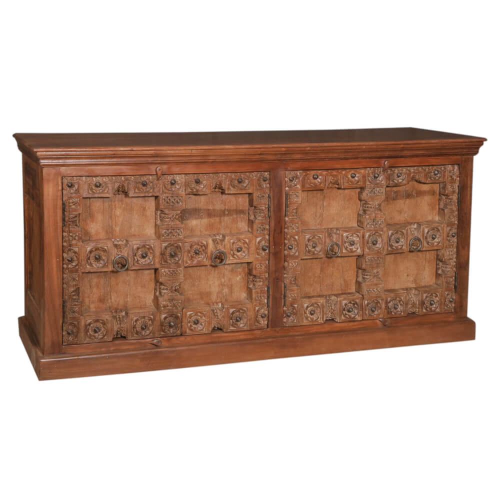 Des sculptures ornementales et des poignées en laiton décorent les panneaux de ce magnifique buffet en bois. Avec ses 2,24 m de long, ce buffet offre un espace de rangement généreux.