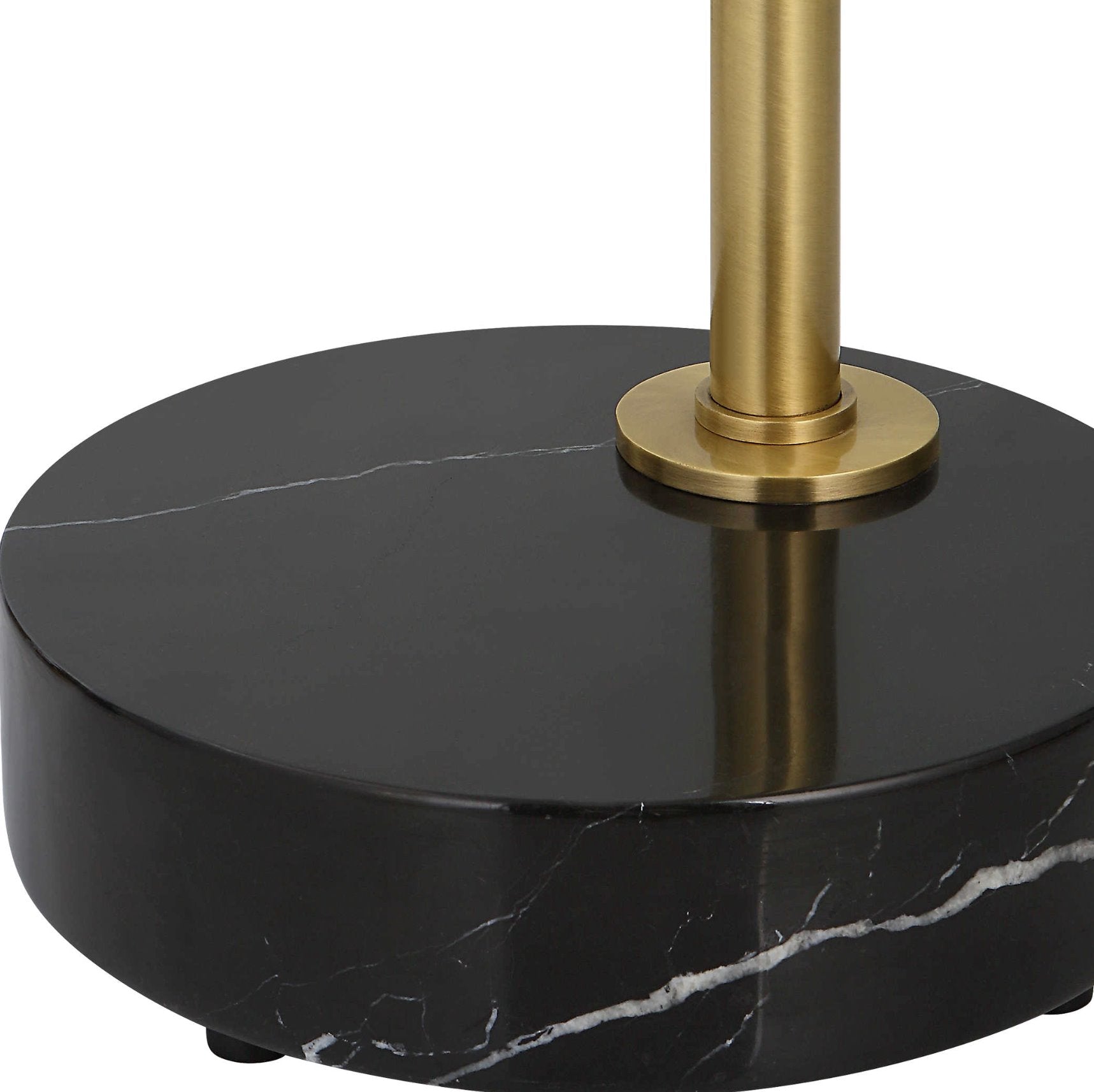 Fabriqué en fer avec une luxueuse finition en laiton antique brossé, le lampadaire Huxford présente un design arqué traditionnel et un col pivotant permettant d'ajuster l'angle de l'abat-jour. Il est élégamment associé à un socle en marbre noir aux veines naturelles et à un abat-jour rond rigide en lin blanc pour un style intemporel.