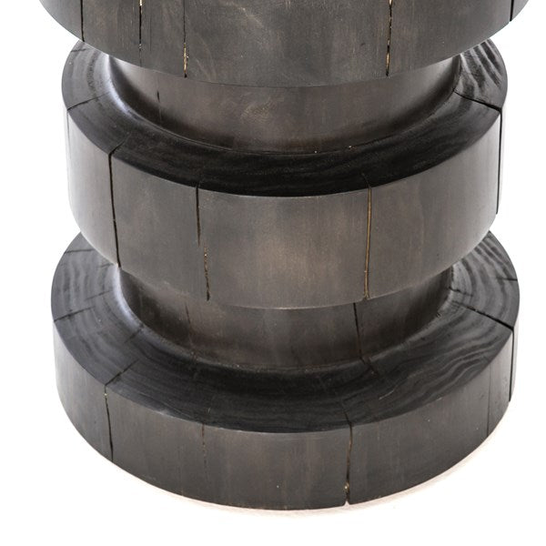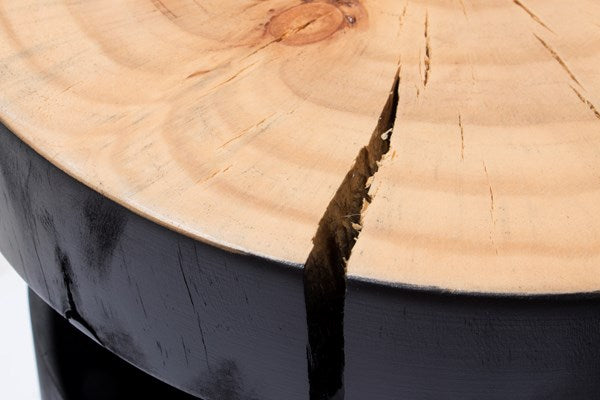 Table d'appoint sculpturale en forme de tambour, Inez est fabriquée en pin massif. Sa silhouette minimaliste met en valeur le caractère unique du bois, nœuds et fissures compris. Chaque pièce est unique. Disponible en deux finitions.