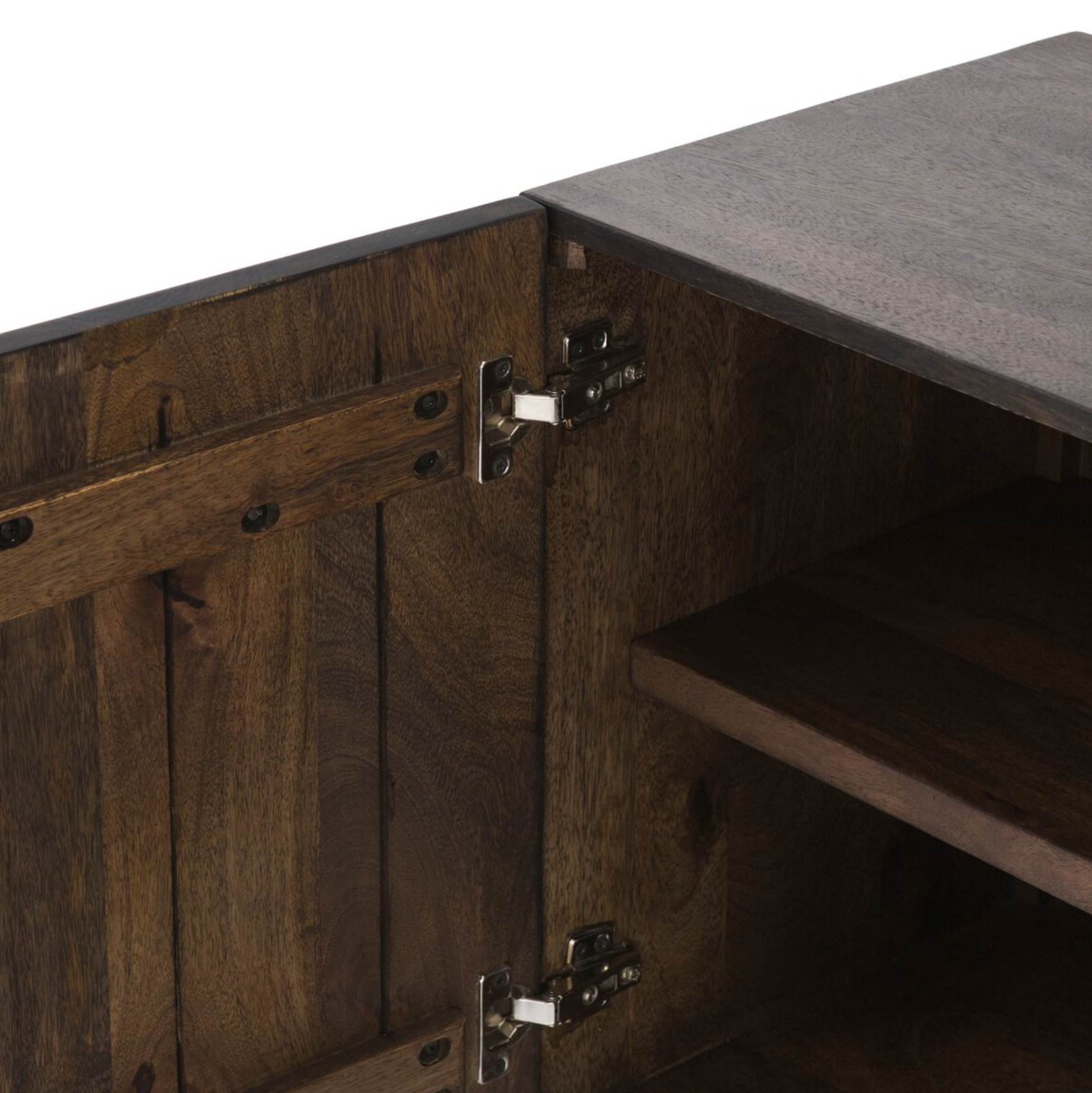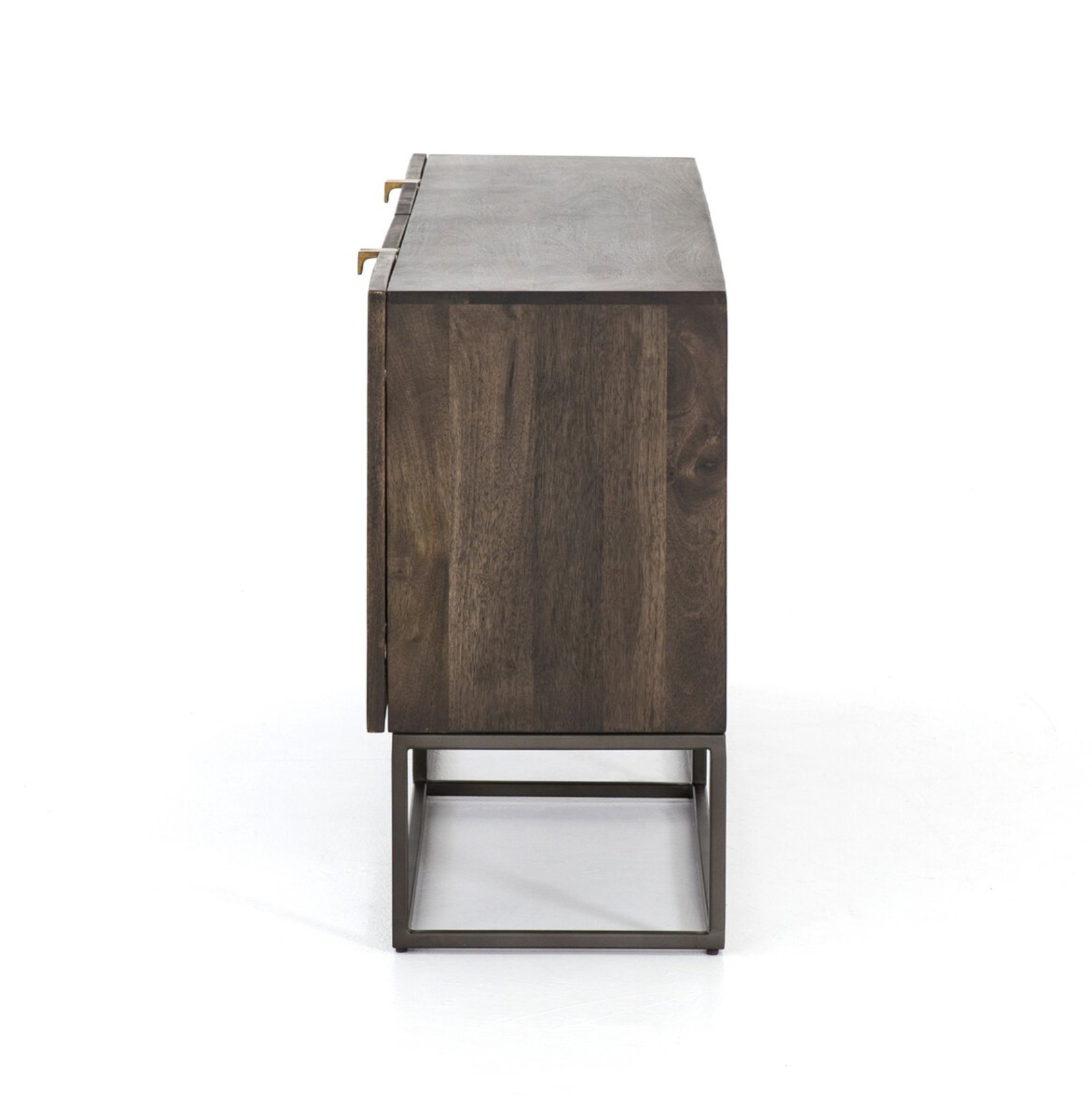 Doté d'un habillage en bois de manguier à la finition marron vintage, le buffet Kelby met en valeur sa texture et son savoir-faire artisanal. Son piètement fin en fer confère à ce meuble de rangement aux lignes épurées une allure aérienne et cage.