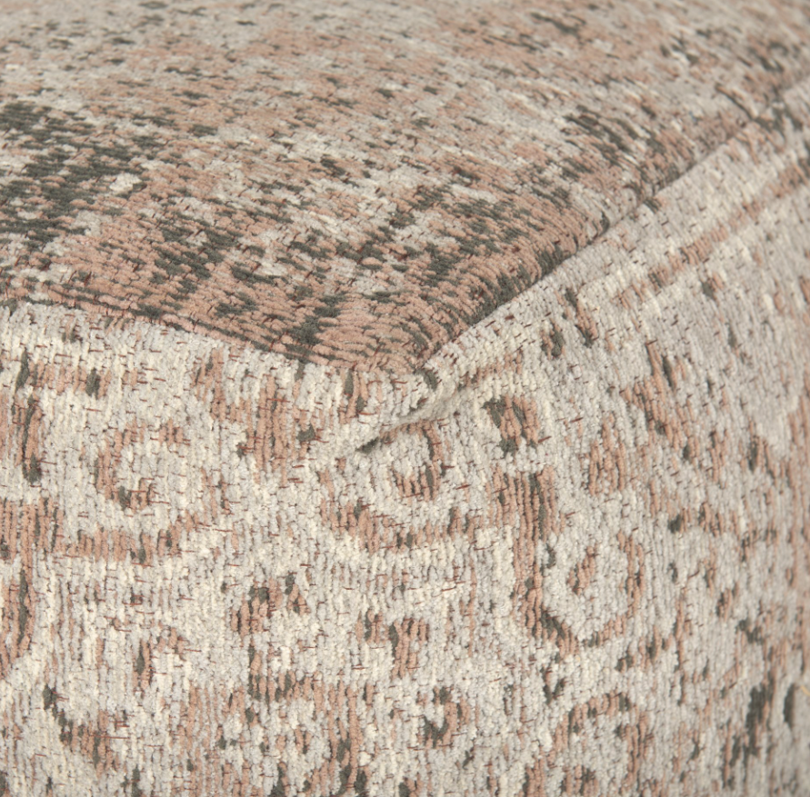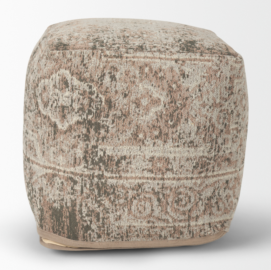 Le pouf Khloe est un petit meuble carré en coton tissé, orné d'un motif inspiré des tapis anciens. Son mélange de tons taupe et gris naturels crée un élément décoratif saisissant qui peut également servir de siège d'appoint.