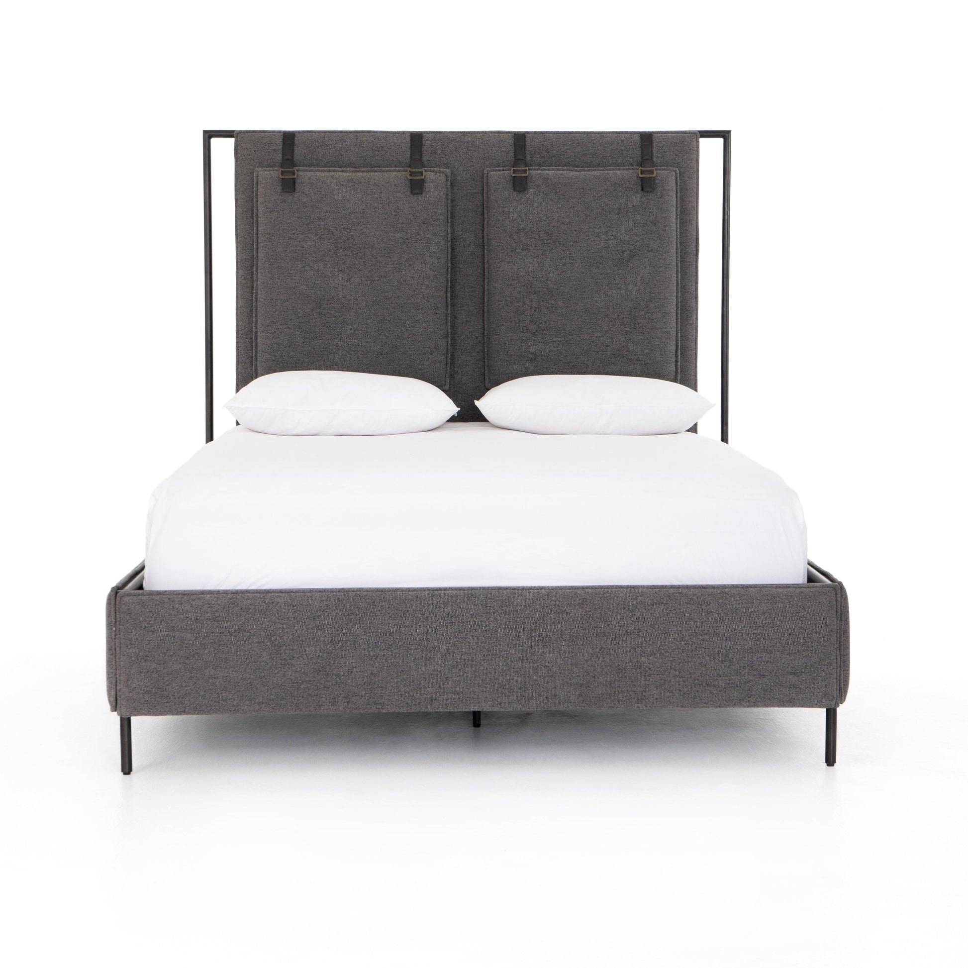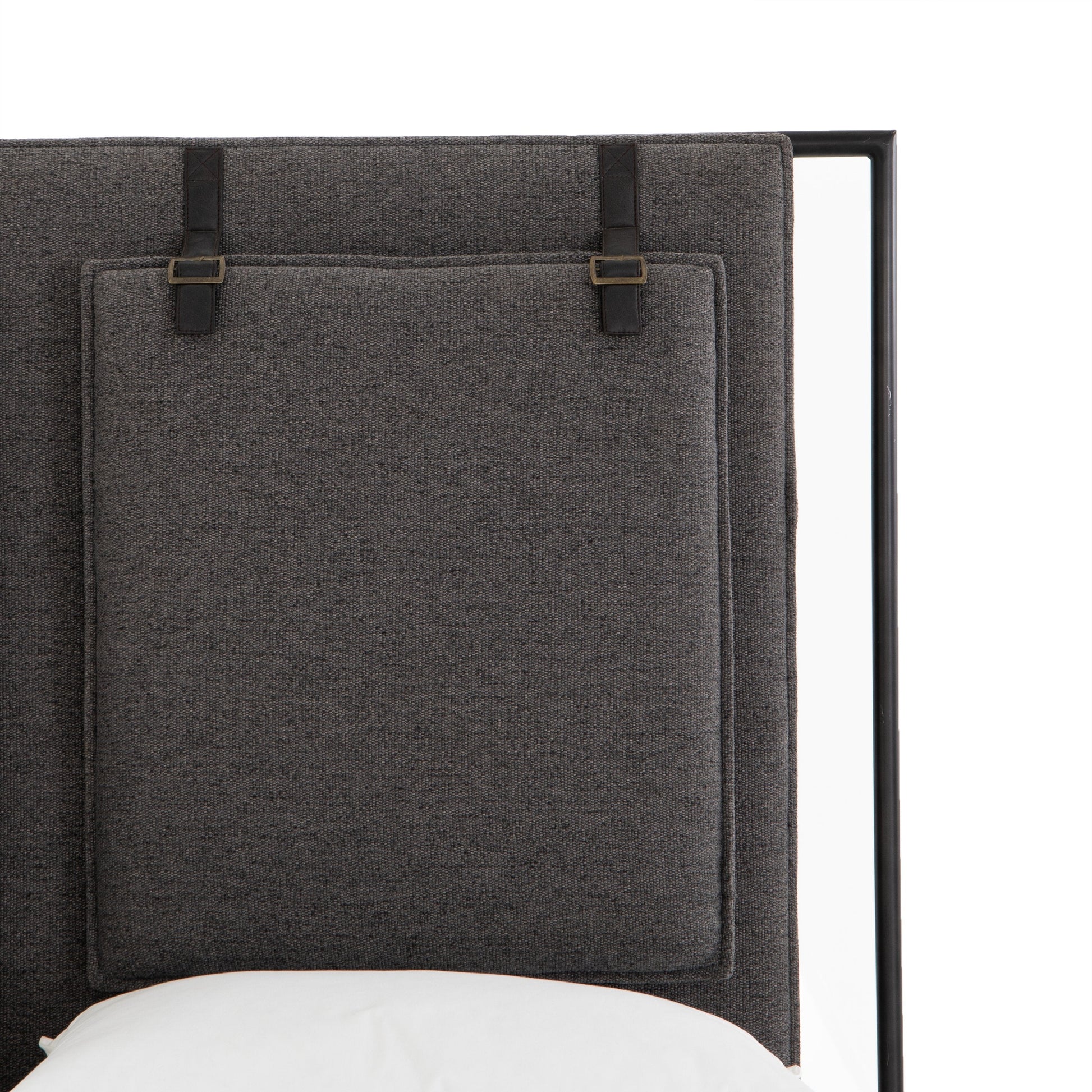 Le style safari se réinvente avec modernité. Un revêtement en lin mélangé gris cendré crée une base riche en textures pour une chambre à coucher résolument contemporaine. Des sangles en cuir noir maintiennent des coussins décoratifs suspendus à la tête de lit, créant un effet saisissant. Sommier requis.