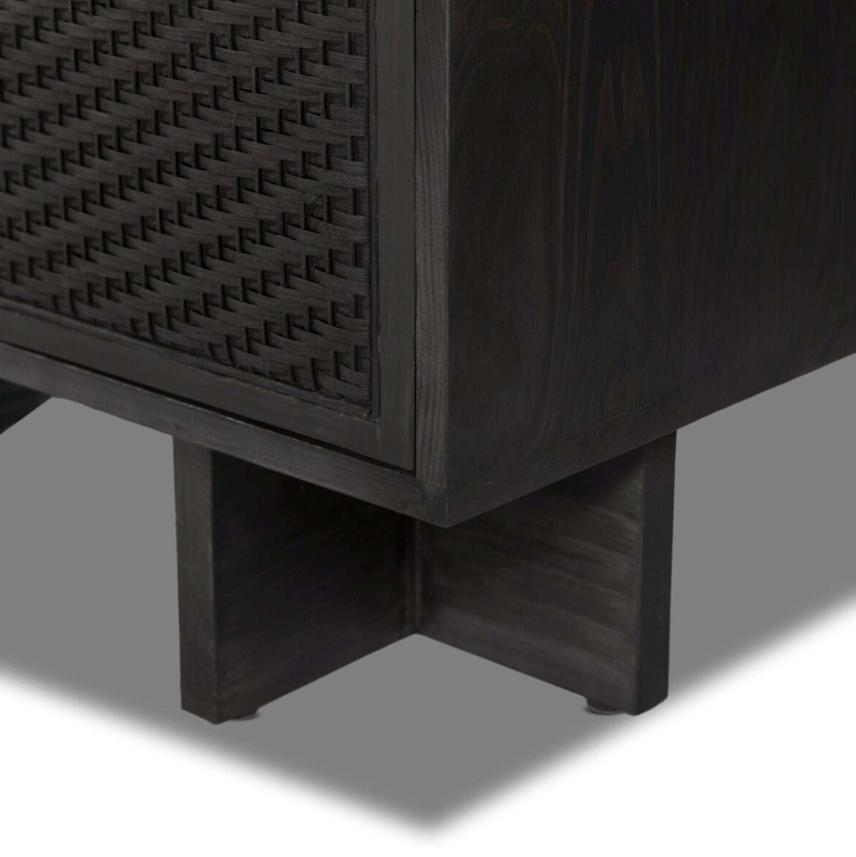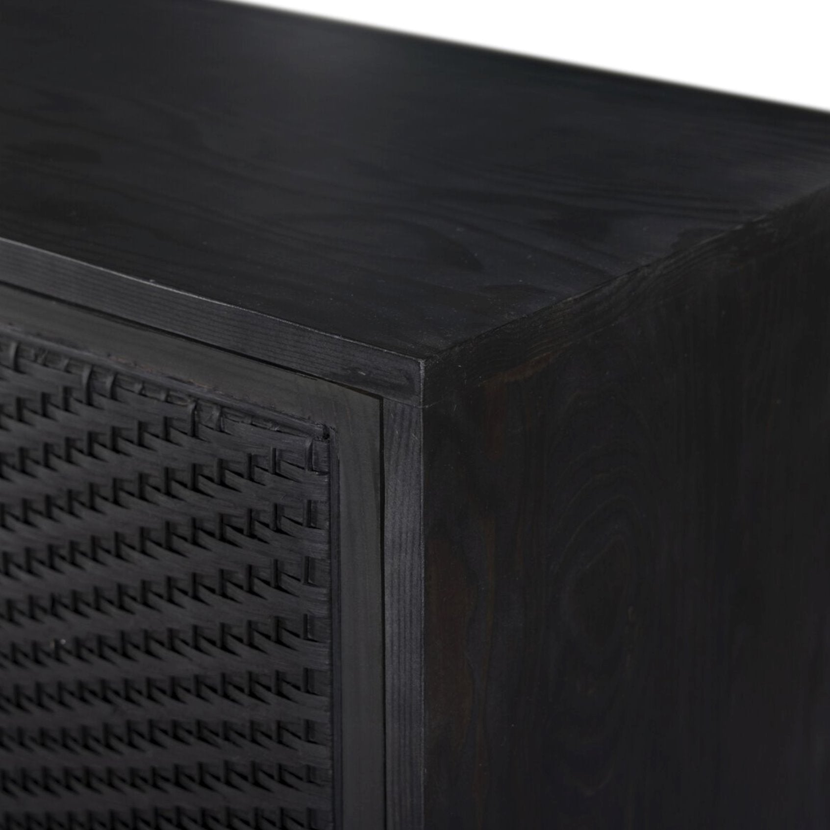 Fabriqué en pin massif avec une finition noire moderne, ce meuble bar intègre des panneaux en rotin qui ajoutent une touche de texture subtile à son design en constante évolution. Il dispose également d'étagères intérieures offrant un espace généreux pour ranger vos accessoires de bar.