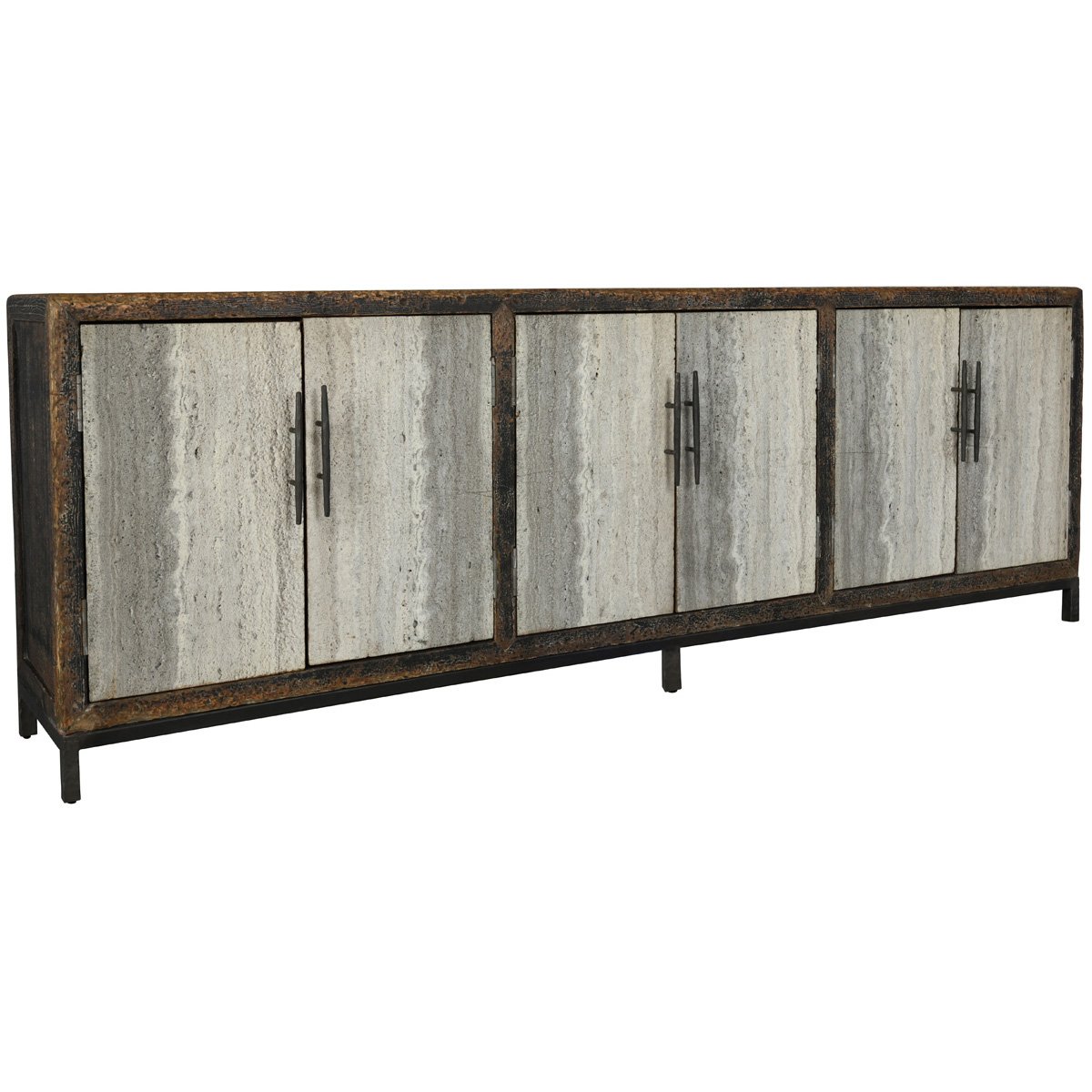 Le buffet Lisbon présente un magnifique contraste entre le granit lisse et le bois de pin rustique et recyclé. Il est doté de trois compartiments de rangement avec étagères intégrées pour un rangement optimal.
