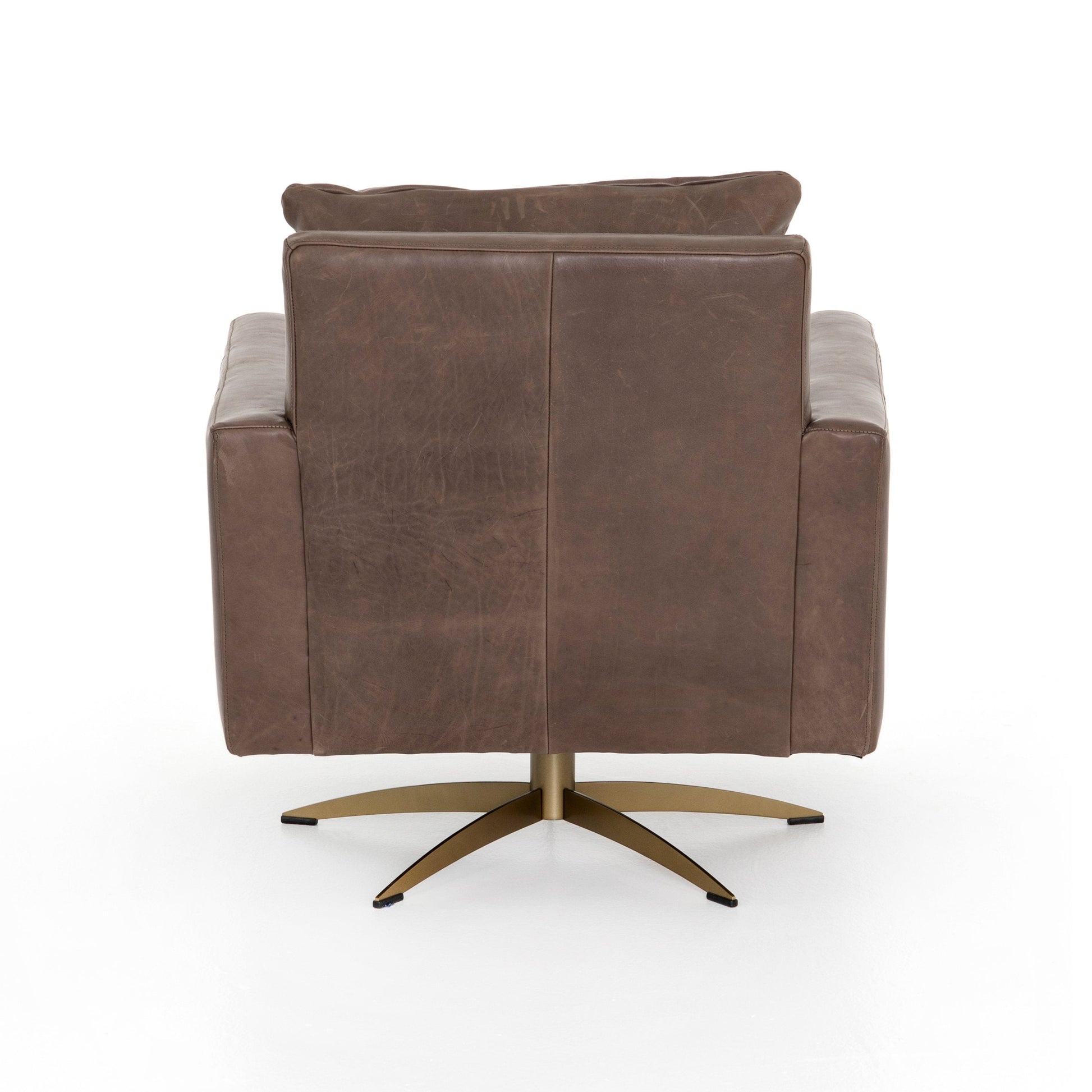 Ce fauteuil classique en cuir marron foncé allie décontraction et élégance. Ses coutures apparentes d'inspiration vintage et son piètement en laiton apportent la touche finale parfaite. Cette chaise n'est pas réglable en hauteur.