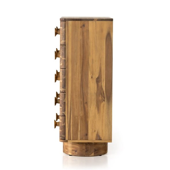 La commode Mallory à 5 tiroirs est fabriquée en bois d'acacia massif et arbore un style scandinave intemporel. La finition naturelle du bois en fait un complément idéal pour une chambre minimaliste, tandis que les poignées rondes en bois des tiroirs créent un point focal tendance.