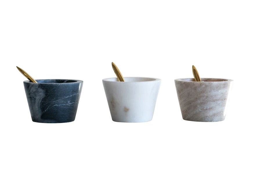 Vendus à l'unité, ces petits bols en marbre sont parfaits pour ranger sel, poivre et autres épices sur votre table. Vous pouvez aussi les utiliser pour l'huile d'olive, les mélanges d'épices, le sucre et bien d'autres choses encore. Achetez-les individuellement ou prévoyez-en un pour chaque convive.