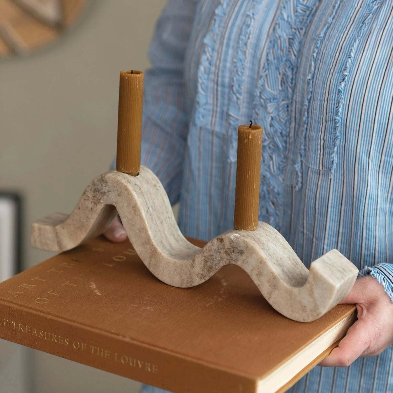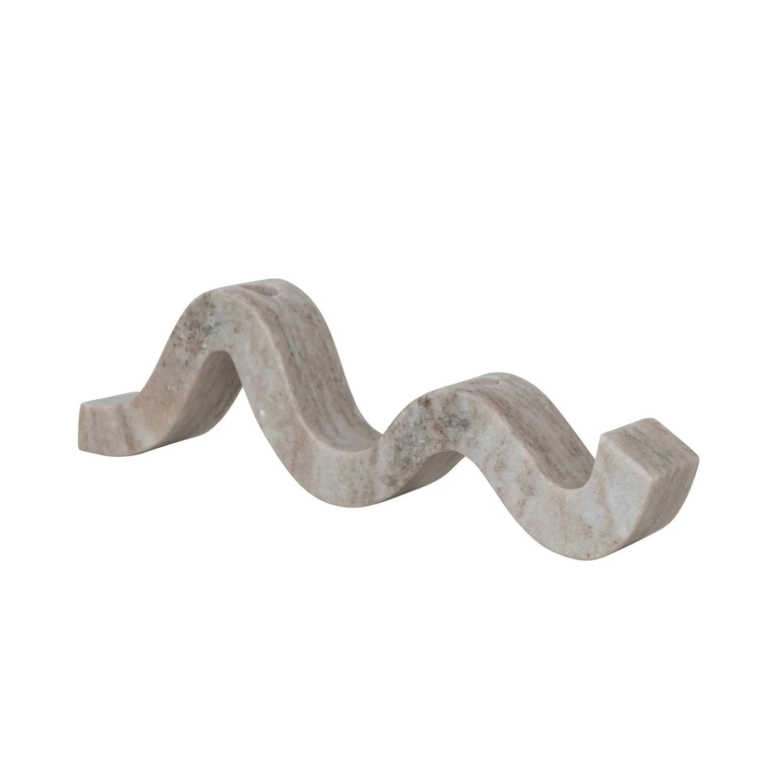 Apportez une touche d'élégance à votre table à manger, votre table basse ou votre entrée avec ce bougeoir. Sculpté dans du marbre massif en forme de vague asymétrique, il allie avec subtilité originalité et raffinement. Peut accueillir deux bougies coniques.
