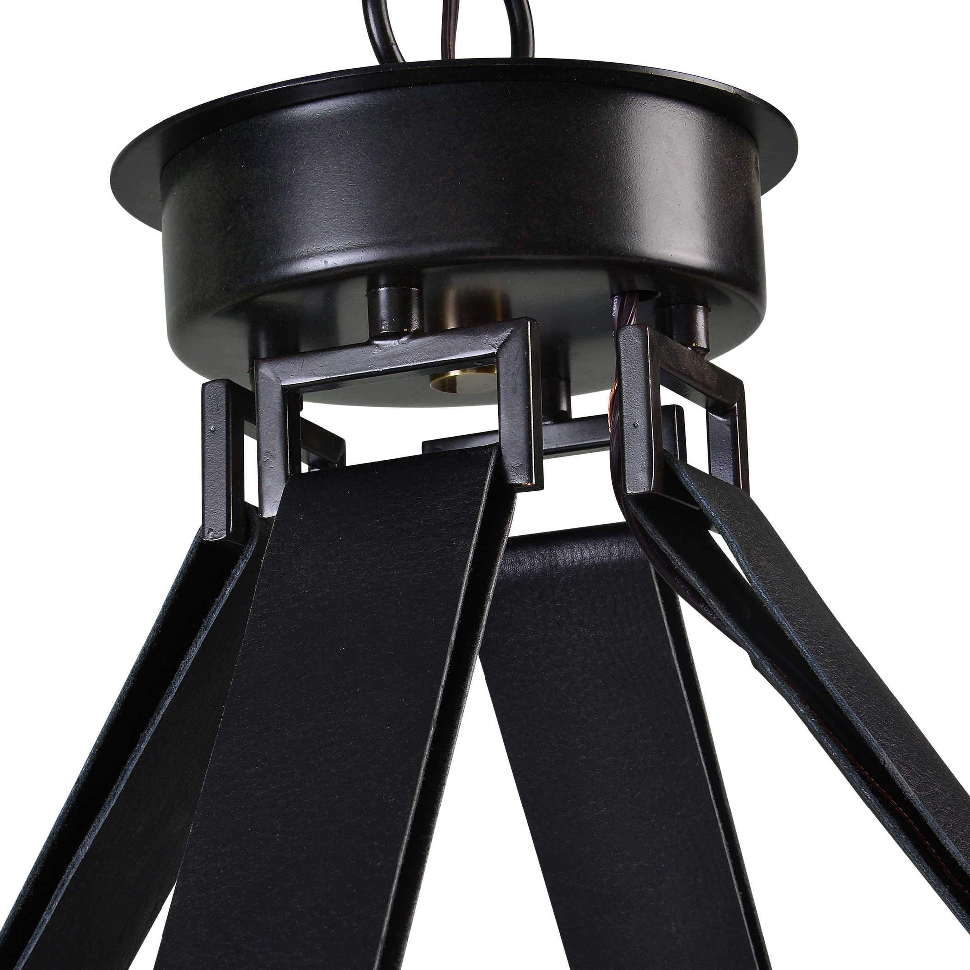 Avec ses lanières de cuir et ses reflets bronze, ce lustre rond est à la fois spectaculaire et résolument moderne. Il est idéal pour les salons, les entrées, les salles à manger et autres espaces qui gagneraient à être subtilement mis en valeur. Disponible en versions 6 et 12 lumières.