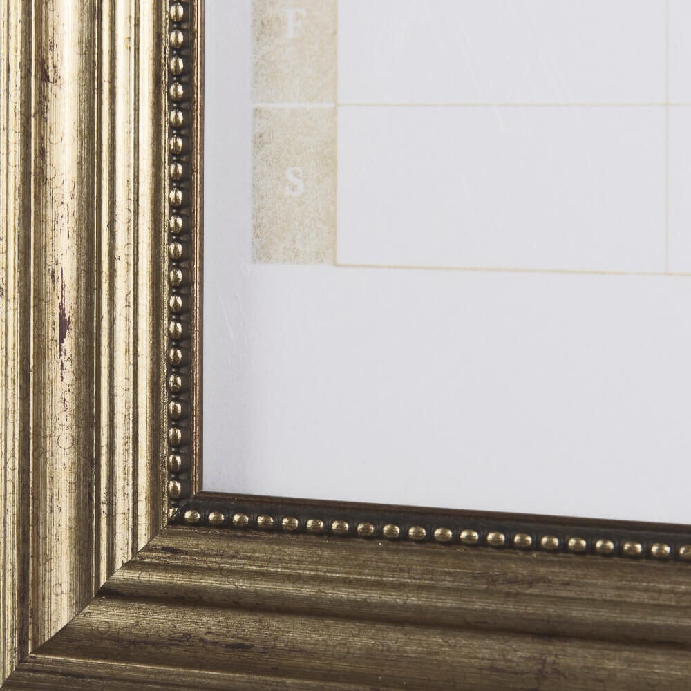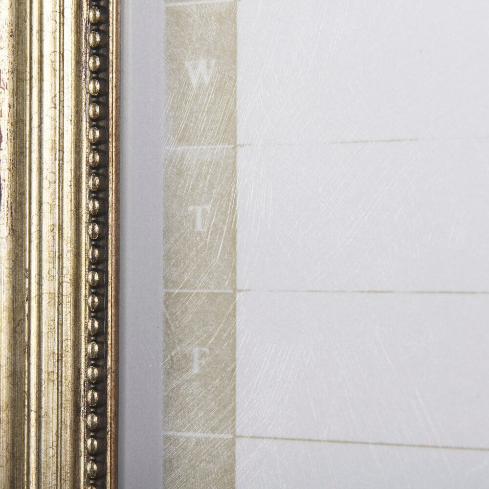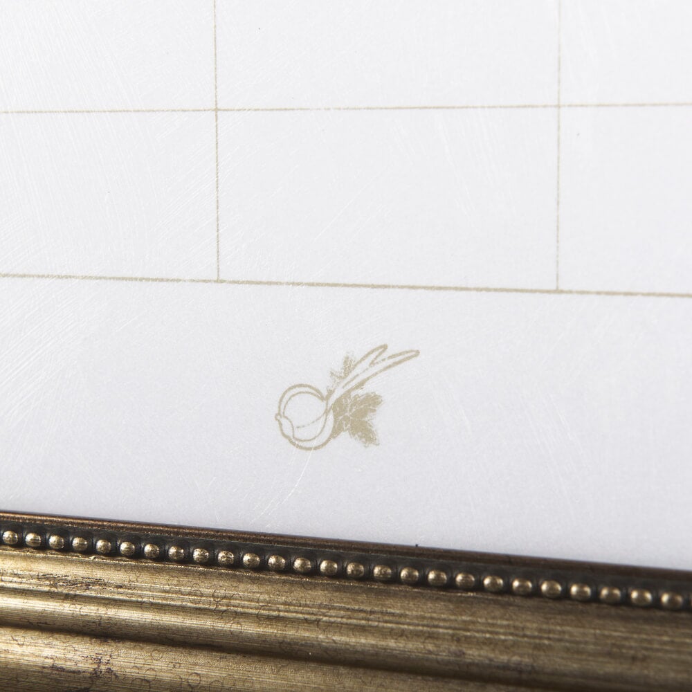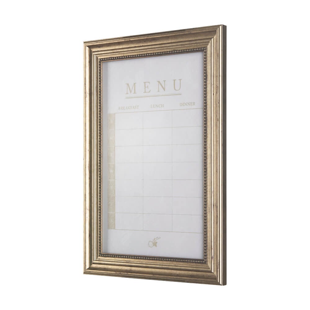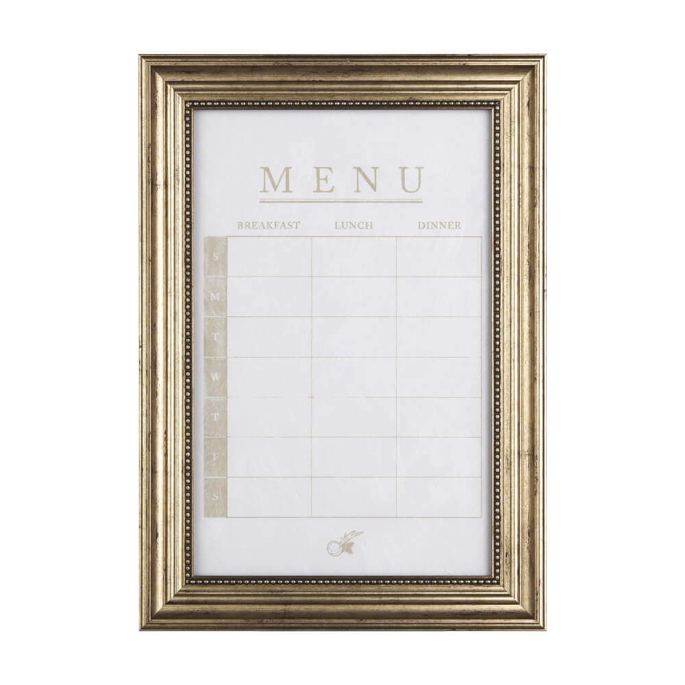 Transformez votre cuisine en un élégant restaurant français grâce à cette œuvre encadrée. Un menu vierge est imprimé dans une subtile teinte dorée sur un papier couleur parchemin. L'ensemble est présenté dans un cadre doré finement travaillé et légèrement patiné.