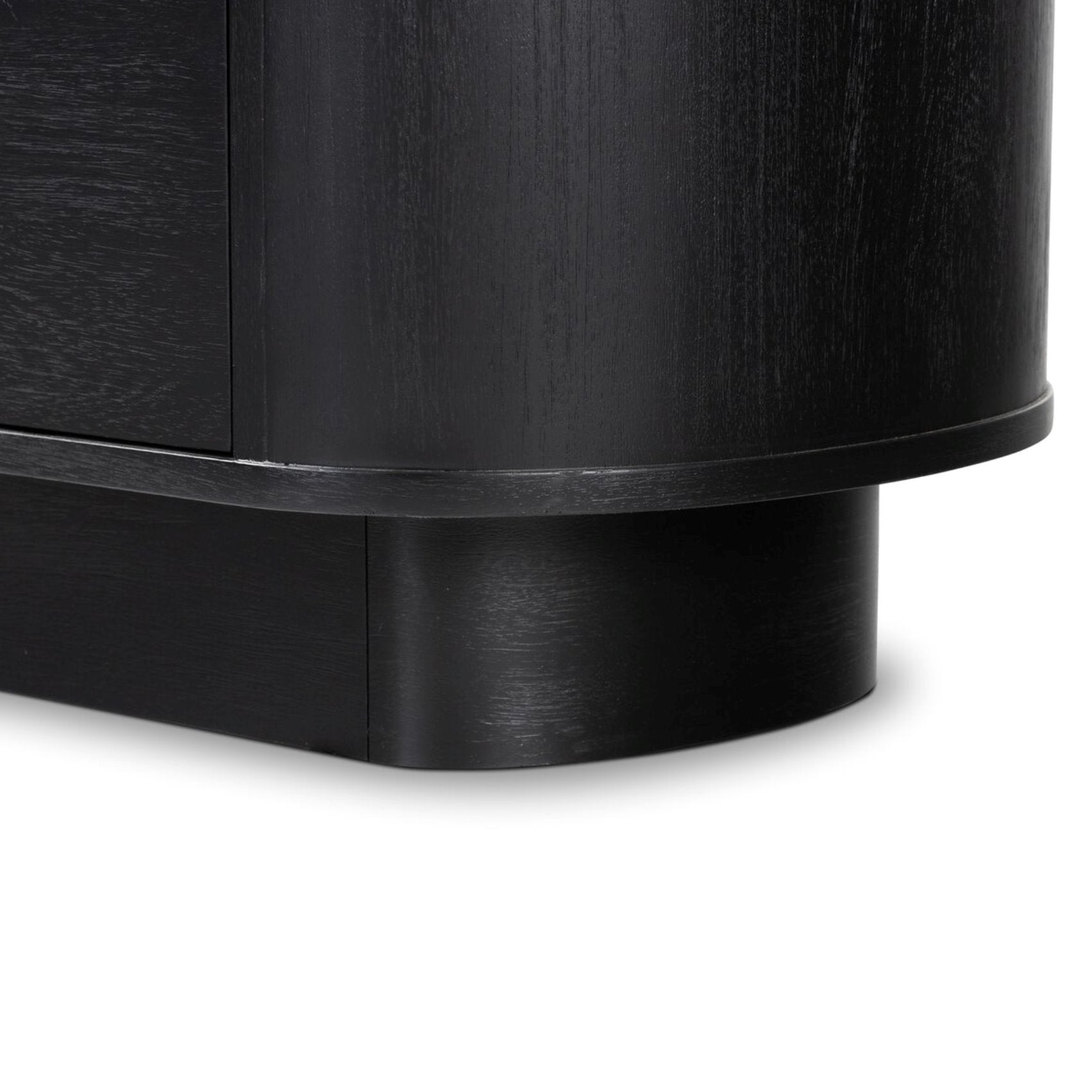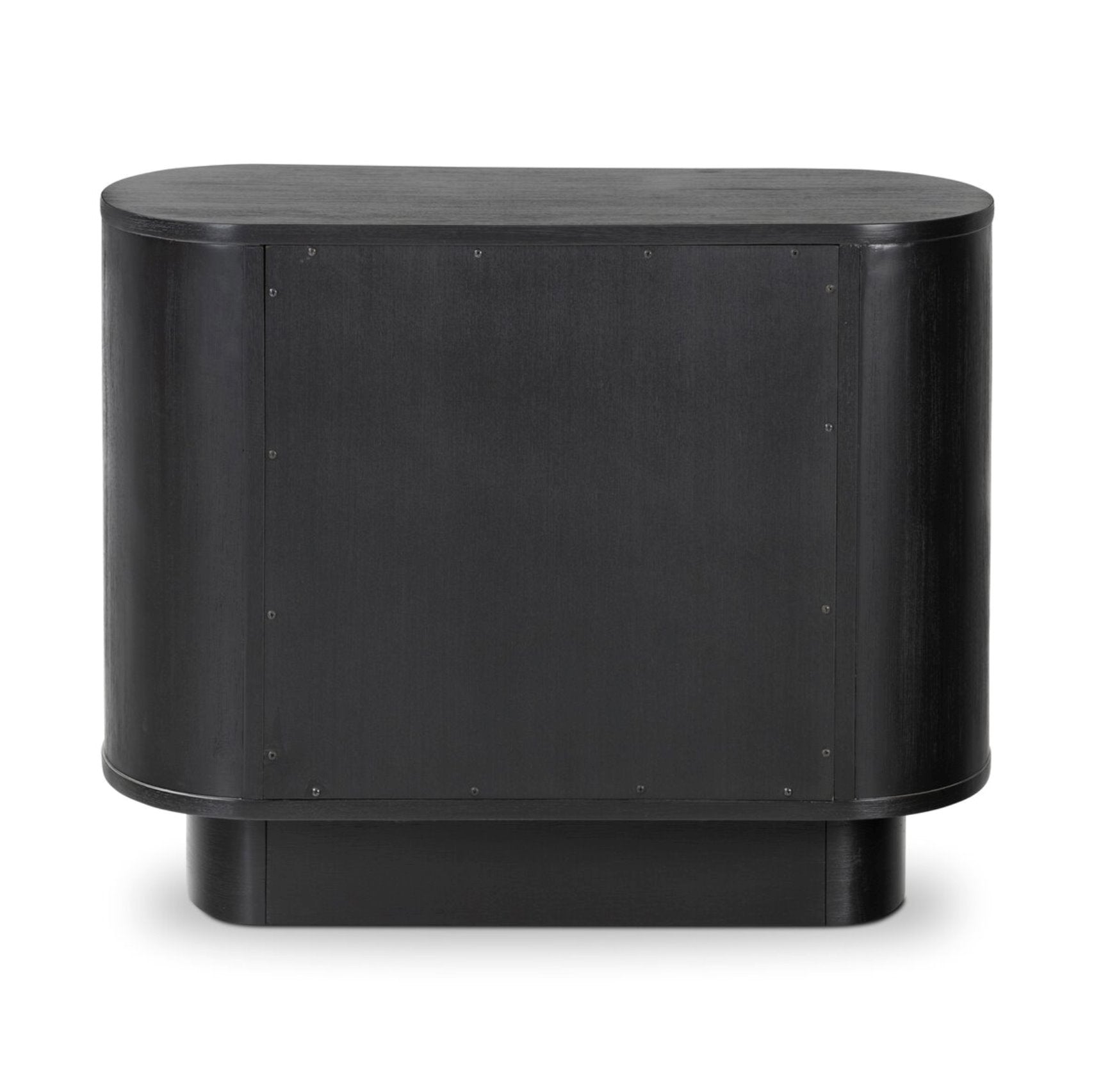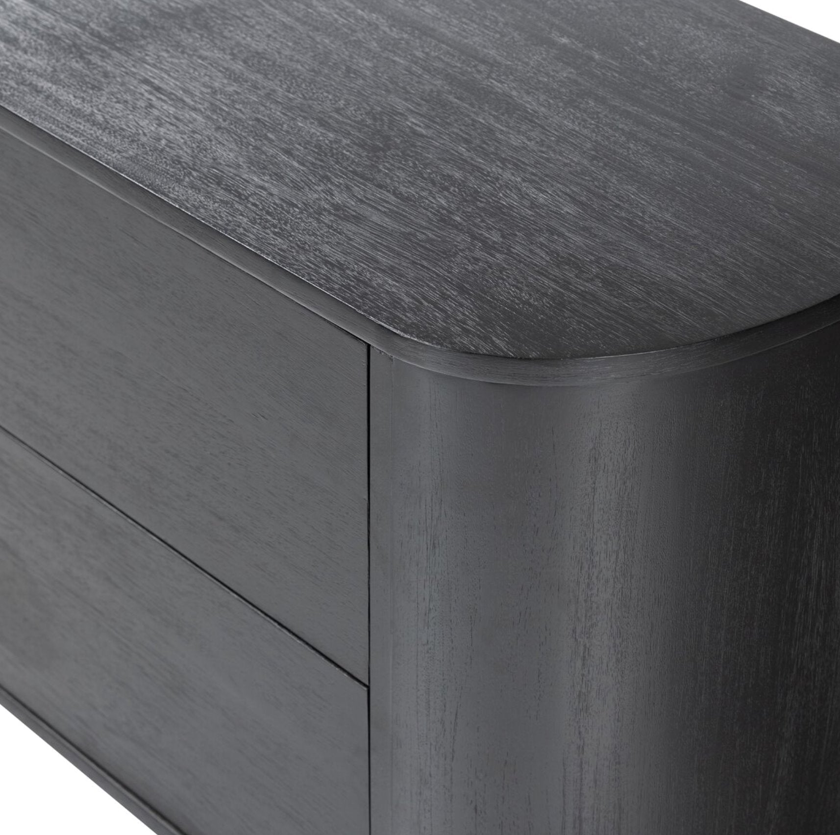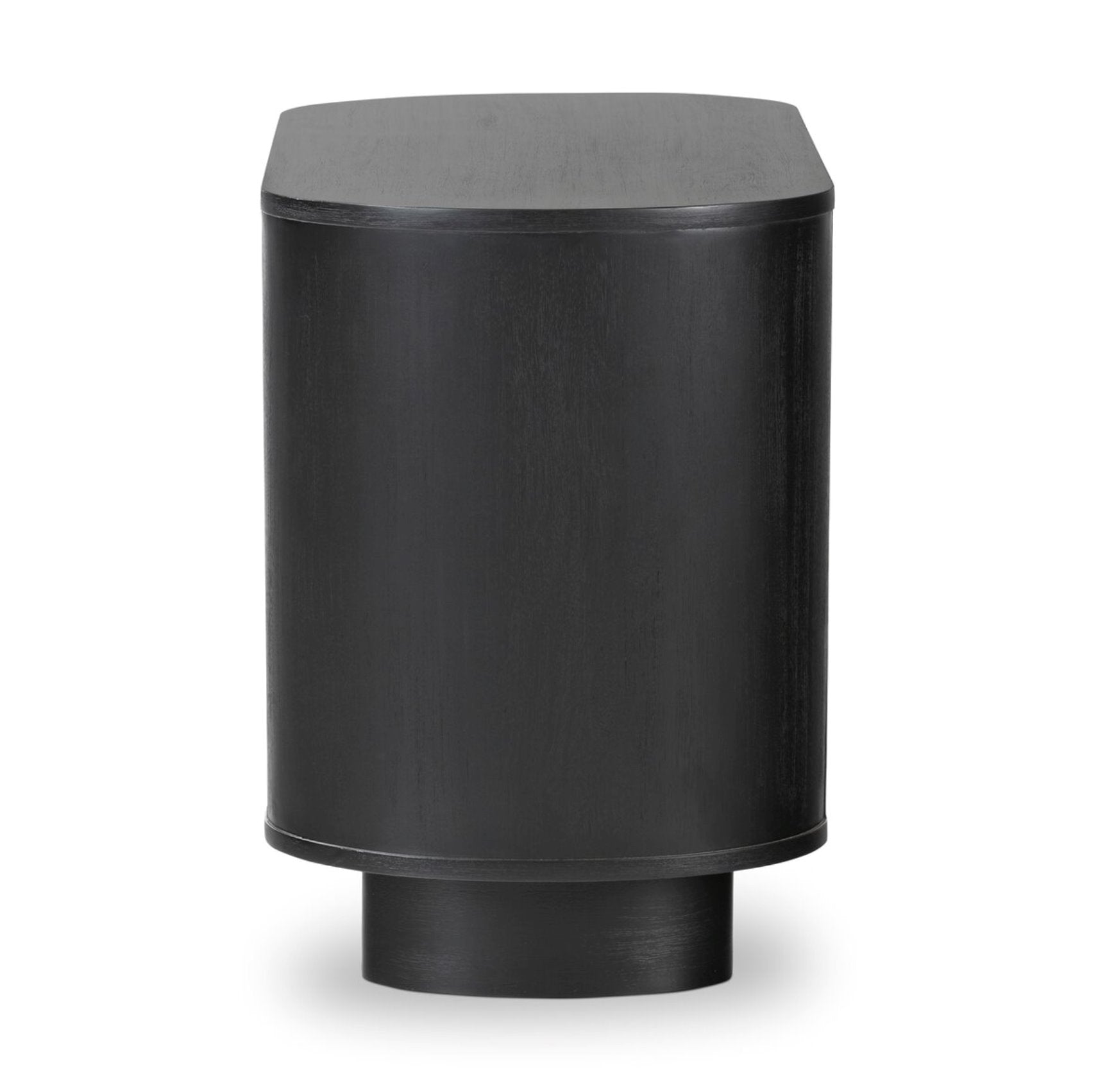 La table de chevet Paden présente un design moderne avec deux tiroirs coulissants, des bords arrondis et une finition noire mate sophistiquée.