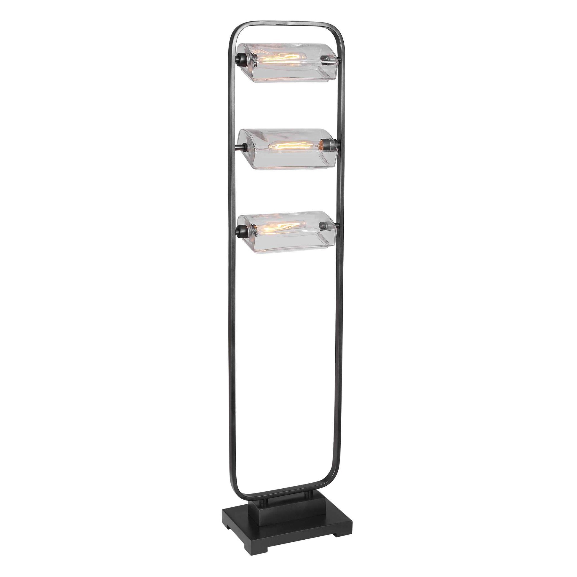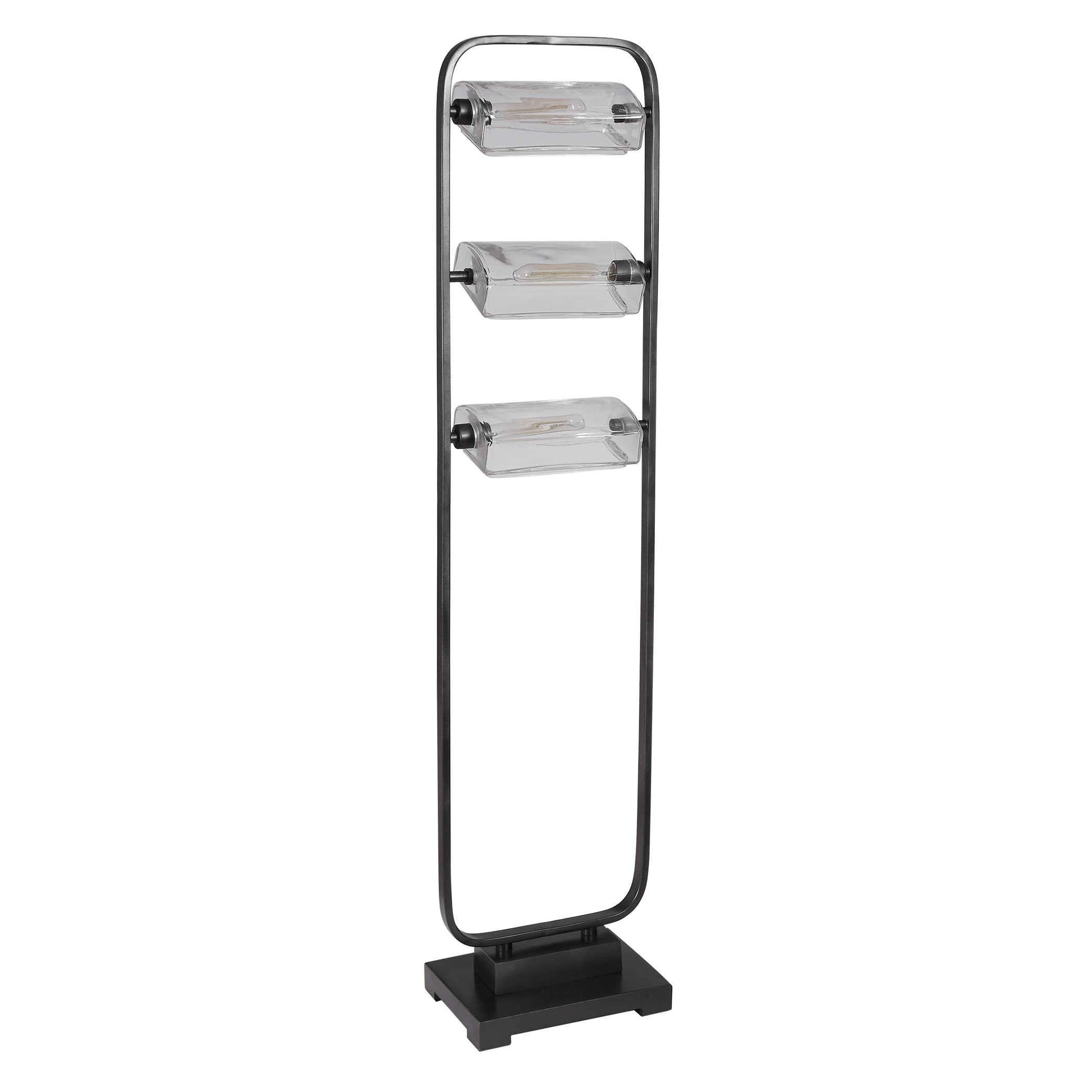 Le lampadaire Pilato est à la fois esthétique et fonctionnel. Il diffuse une lumière abondante, idéale pour illuminer un espace. Fabriqué en fer forgé avec une finition bronze foncé plaquée, il est doté de trois abat-jour suspendus en verre épais transparent.